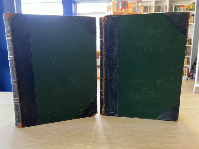 Four volumes bound in two, most likely published in the 1890s. Quarter bound in black with green cloth boards and marbled end papers. Panelled spine, gilt ornamentation and title, volume number and author in gilt lettering. Good condition only. The boards and binding show heavy signs of wear, with bumped and damaged corners and wear to the spines. The front board on the first book (Vol I - II) is becoming partially detached, with exposed binding. The front board on the second book (Vol III - IV) was detached but subsequently repaired, with slight damage to end papers. Please note that this is a very heavy set and is likely to require additional shipping costs.