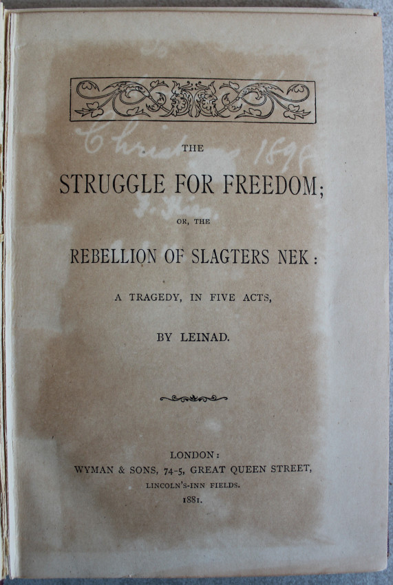 In 1881, (or 1880 if the historian Heese is right) just at the time of the Anglo-Transvaal War, a play was published in London called The Struggle for Freedom or, The Rebellion of Slagters Nek, written under the pseudonym ‘Leinad’. Leinad is Daniel. He was the youthful John Daniel Kestell, then twenty-six, destined to become one of the cultural leaders of nascent Afrikaner nationalism. The young dramatist was the future “Vader” Kestell, theologian and pastor, devoted military chaplain to the Boer forces in the Anglo-Boer War, one of the Boer negotiators at the Peace of Vereeniging, founder and first Rector of Grey College, Bloemfontein, which was to become the University of the Orange Free State. A small town in the eastern Free State is named after him. He was also an enthusiastic Shakespearean. Partly of British descent, his grandparents on the father’s side were 1820 Settlers in the Eastern Cape. His father married into the Afrikaans community, serving as Deacon in his congregation. John Daniel was brought up and educated in Pietermaritzburg, that outpost of lovely Victorian architecture with Afrikaans street names, capital of the Colony of Natal. https://repository.up.ac.za/items/6620816c-575e-4f85-9b00-4161156926cb