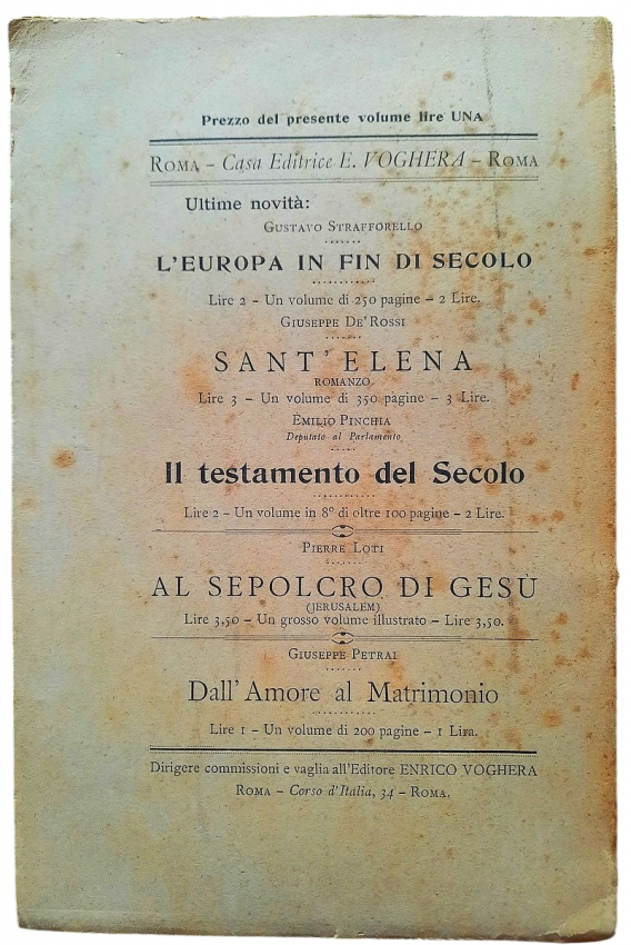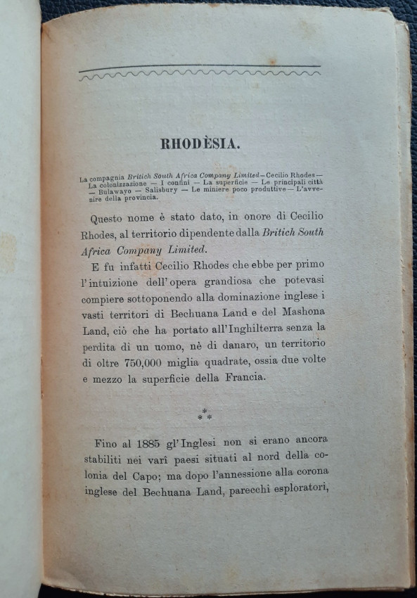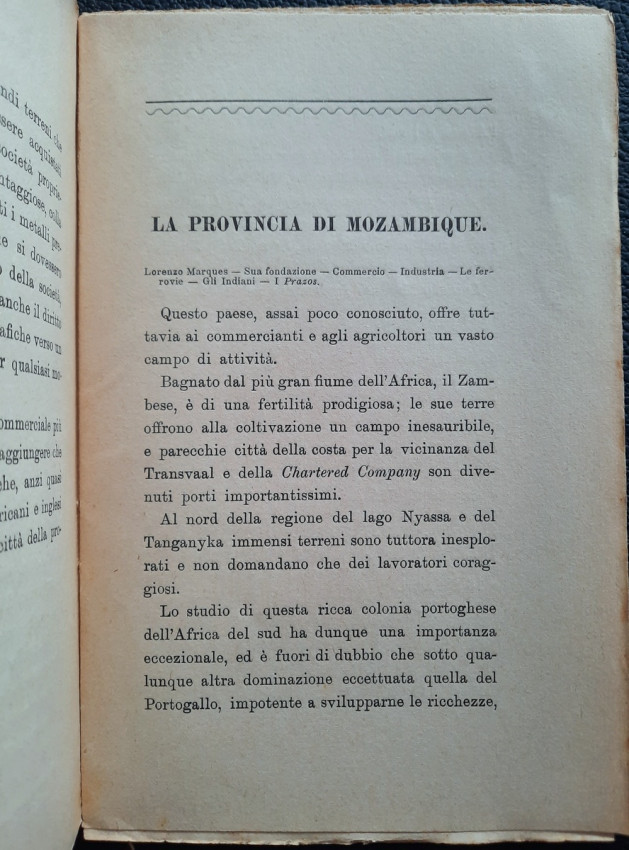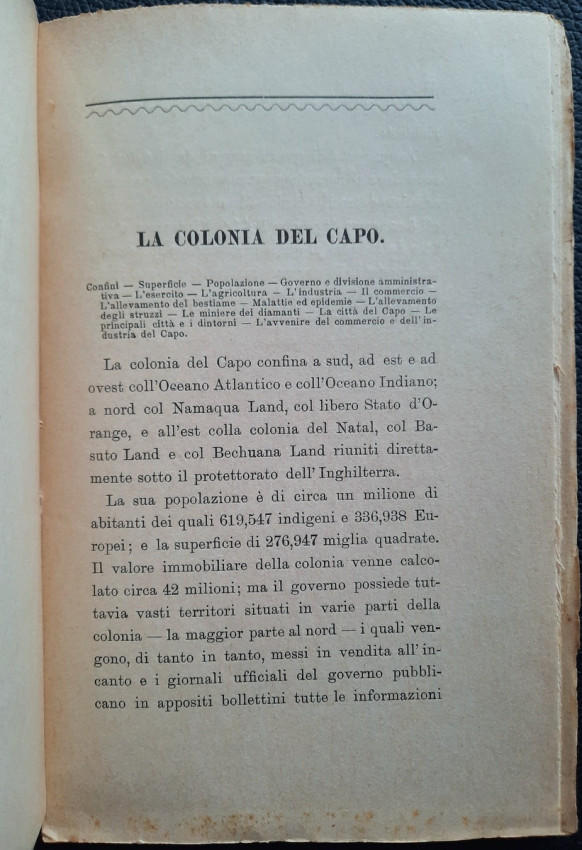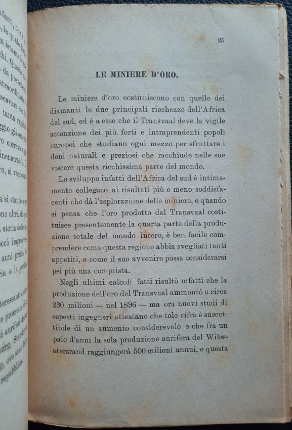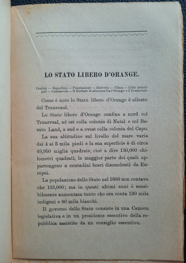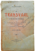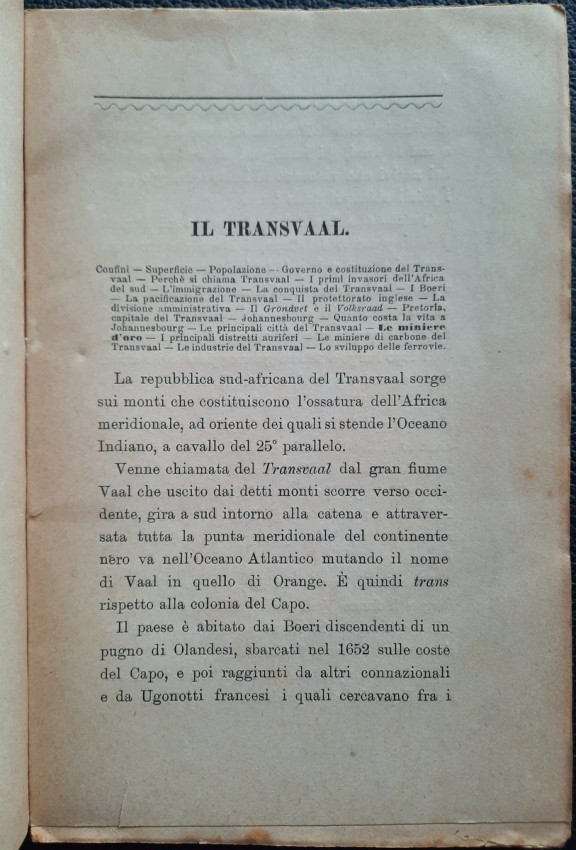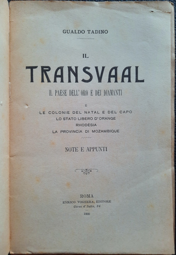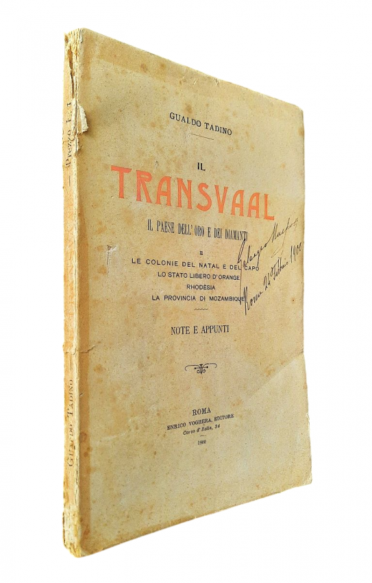 "Il Transvaal il Paese dell' Oro e dei Diamanti. E Le Colonie del Natal e del Capo, Lo Stato Libero d'Orange, Rhodesia, La provincia del Mozambique. Note e Appunti."; Paperback; Text in Italian; Collation complete - Title page, 92 pages, Index; Paperback binding overall worn, with a tear to the top of the front joints (4 cm), missing pieces at the top and bottom of the spine (1 cm), but the rest of softcover binding remains whole and regularly attached to the text block. Covers little dusty and with yellowing and scattering foxing. A slight starting crease to the bottom of the front cover and title page. Inscription by ink to the front cover. Pages/Text block in good condition, with some yellowing and sporadically scattering light foxing, no marking or annotations. Occasional minimal traces of wear on the edges of the text block, the fore edge is slightly deckled.