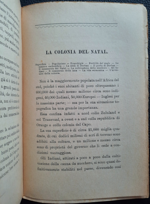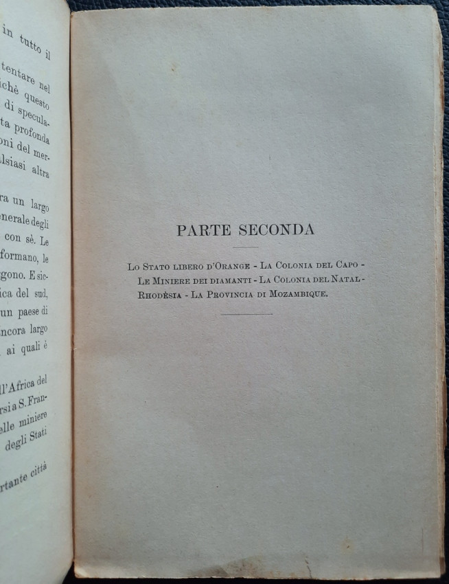 The second part includes chapters about The Orange Free State (with sections: Borders; Area; Population; Army; Climate; Main cities; Trade Alliance between the Orange and Transvaal); The Cape Colony (with sections: Area; Borders; Population; Government and administrative divisions; Army; Agriculture Industry; Trade; Livestock farming; Diseases and epidemics; Ostrich farming; Diamond mines; Cape Town; Main cities and surrounding areas; The future of trade and industry in the Cape); The diamond mine (with sections: The first diamonds; The big companies; The diamond monopoly; The largest diamond in the world); The Colony of Natal (with sections: Area; Population; Exemption; Fertility of the soil; The coal mines; The city of Durban; The port of Durban; The Natal trade; The cultivation of sugar; The Indians; The wool trade; Economic life; The future of the colony); Rhodesia (with sections: The British South Africa Company Limited; Cecil Rhodes; Colonization; The boundaries; The area; The main cities; Bulawayo; Salisbury; The unproductive mines; The future of the province); and The Province of Mozambique (with sections: Lorenzo Marques; Its foundation; Commerce; Industry; The railways; The Indians; The Prazos).