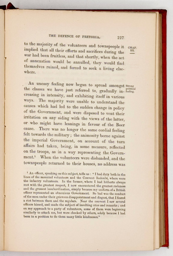 Mendelssohn (Sidney) South African Bibliography volume 1, page 113, 'It is admitted that the accounts given, as well as “the opinions expressed, are mainly based upon official documents." The author de-scribes the contest as "a most unnecessary war," and states that " too great eagerness to carry out a federation scheme defeated its own object, leading as it did to a too hasty annexation of the Transvaal — the primary cause of the Zulu War, and bringing in its train the Boer rebellion." It is pointed out that although a Liberal Government had replaced the Conservative administration under which the Transvaal was annexed, the promises of self-government for the country, made by Sir T. Shepstone, had not been kept, and that when the Cape Parliament rejected the proposal for a conference on the subject of Confederation, it was resolved to further withhold self-government from the Transvaal Boers in order to induce them to throw in their lot with the Cape Colony. The substitution of Sir Owen Lanyon for Sir T. Shepstone seems to have been injudicious as well as unfortunate. Lanyon was of swarthy complexion, and the Boers thought he was of black descent and disdained to be ruled by him: he was a British soldier (" rooibatje "), and as such an object of detestation to these people; unlike Shepstone, he did not speak or understand their language, although he did his best to conciliate them in his own way. Some time before hostilities broke out, Colonel Bellairs had drawn attention to the faulty disposition of the troops in the country, and had protested, but vainly, against the reduction in their numbers ; and it is asserted that the withdrawal of the " King's Dragoon Guards " partook of something of the nature of a gambler's stake on chance, " to effect an economy of a few thousands." The British authorities appeared to have been permeated with the idea “that the Boers were wanting in pluck and would therefore not become dangerous." The volume gives an account of " the origin of the Boer revolt," and describes " the Bronkhorst Spruit disaster," "the defence of Pretoria," and the sieges of Potchefstroom, Rustenburg, Marabastadt, Leydenburg, Standerton, and Wakkerstroom; and there are chapters on "the Natal Relief Column," and "armistice and peace." The account of the siege and defence of Pretoria is very interesting, and it is to be remarked that many of the Boers are mentioned as fighting on the British side, among other well-known names being those of Mr. Justice Kotze and Chief Justice De Wet, and many quotations are given from the newspaper published during the siege, entitled News of the Camp (see Duval, Charles). Among the besieged were the wives of Dr. Jorissen, State Attorney, and Mr. Bok, State Secretary of the Boer Government, these ladies being accommodated in the Jail Laager. In the Appendix there is an extract from the report of Captain Raff, C.M.G., dated Potchefstroom, November 28, 1880, which gives details of a meeting between George Hudson, Colonial Secretary of the Transvaal, and Kruger, Cronje, Bodenstein, Fouche, and other prominent Boers, at which Kruger and Cronje condemned the action of the English Government with reference to pressing Bezuidenhout's case during the prevailing discontent, and stated that the people were exasperated by such ill-timed severity, and that they washed their hands of all responsibility.'
