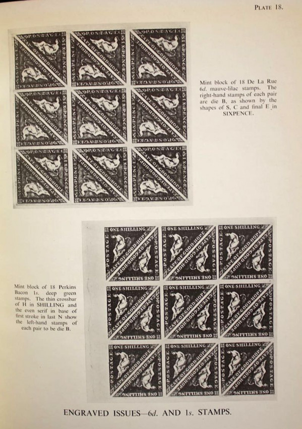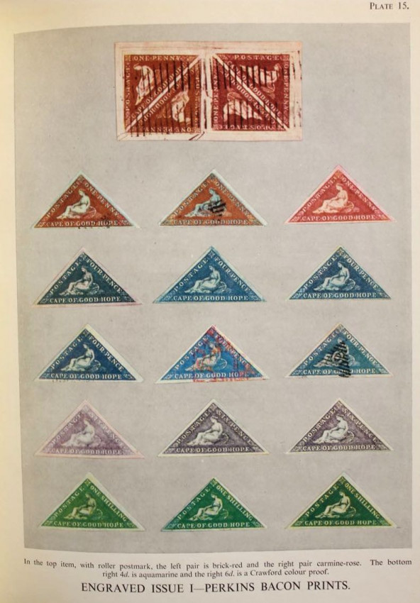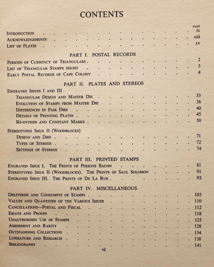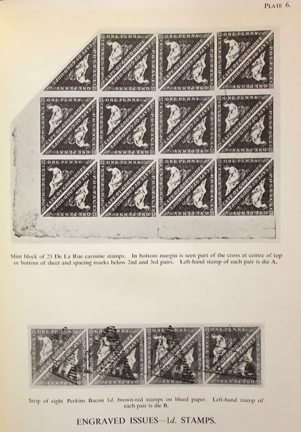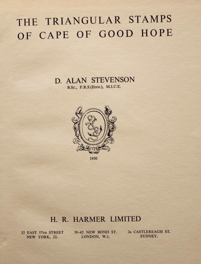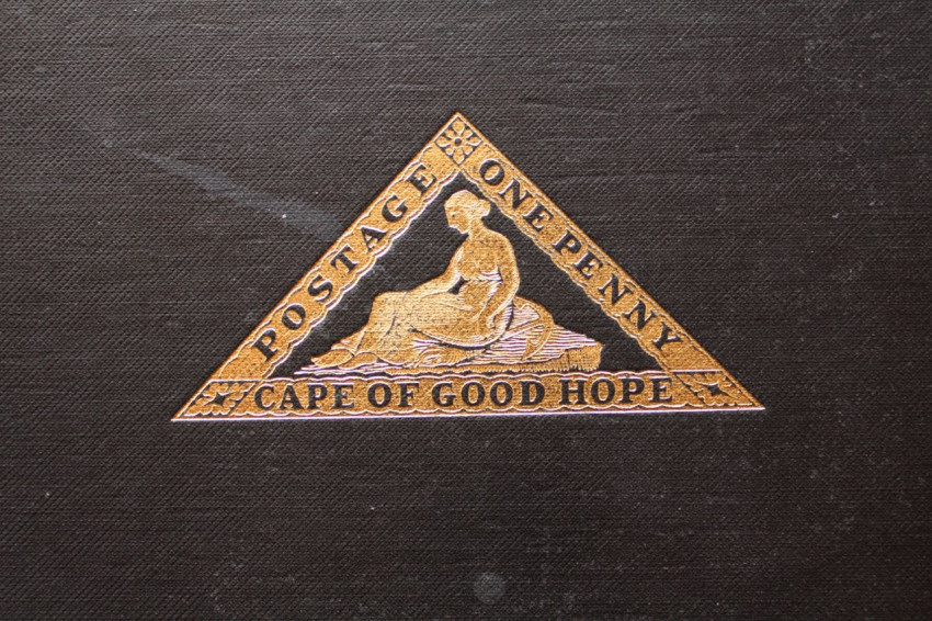 Publisher's black cloth binding with embossed gilt design of the famous Cape triangular stamp on front panel and gilt titles on spine.