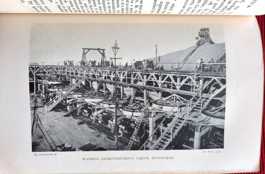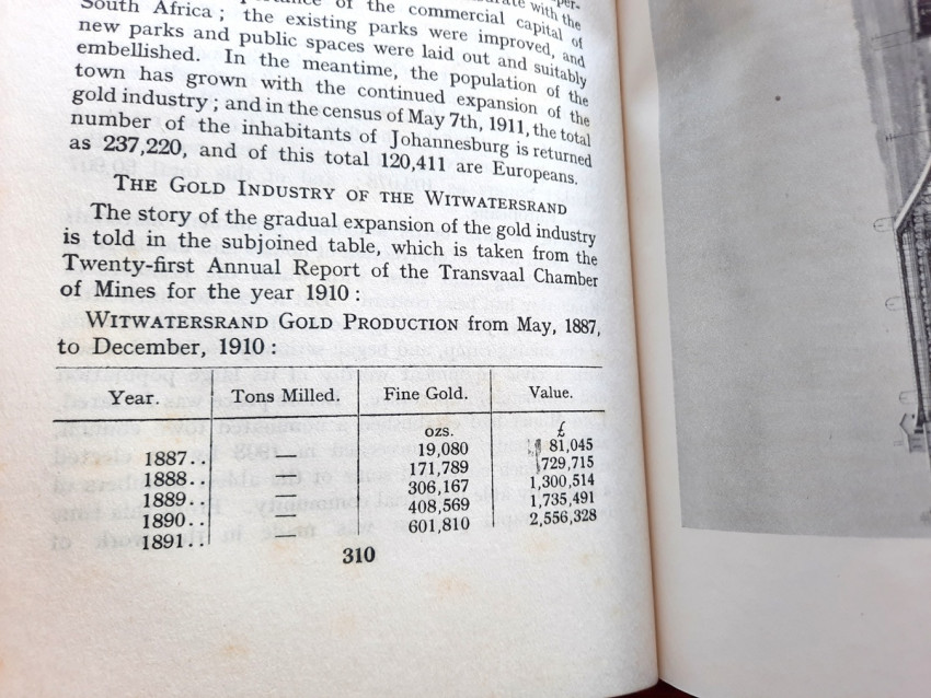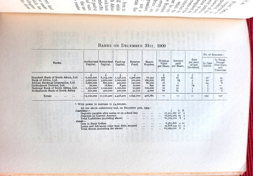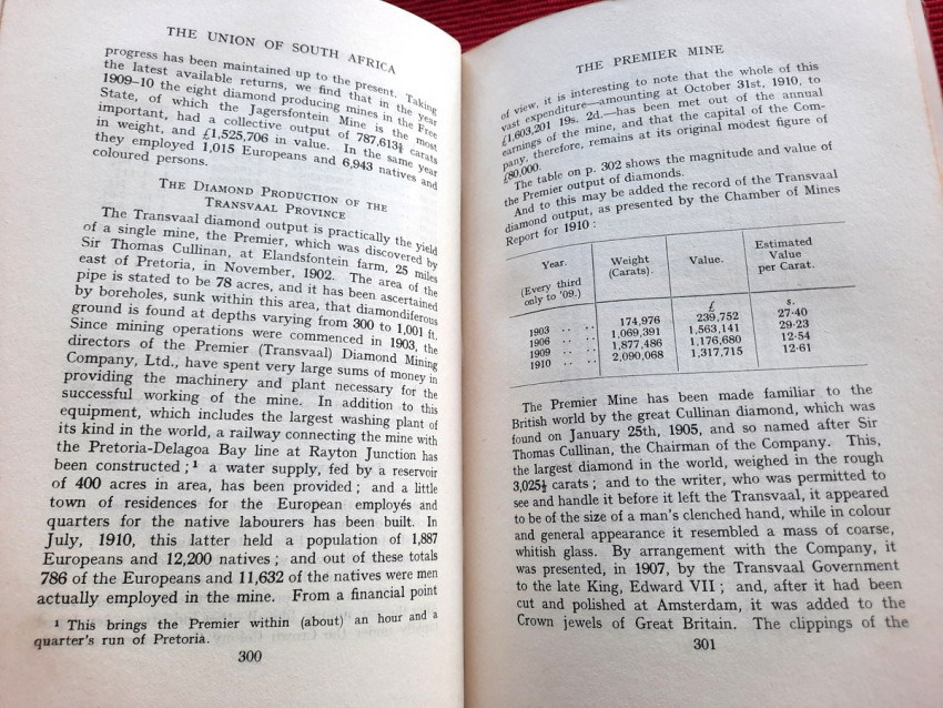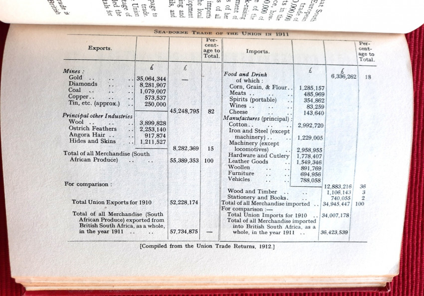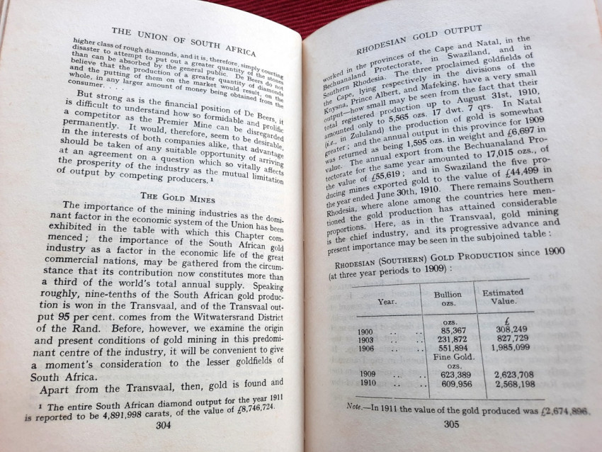 A scarce work with 24 photographic plates (including frontispiece) and folding color map of the "Union of South Africa" at the rear. Front paste down and front free endpaper with colored map of "The British Empire in 1800"; rear free endpaper and rear paste down with colored map of "The British Empire in 1900". Also contains numerous tables and statistical informations, many on the mining, diamond and gold industry (including the Transvaal Gold Production from 1892-1910 and Witwatersrand and Rhodesian Gold Production), the chapter about The Dutch East India Company, etc.