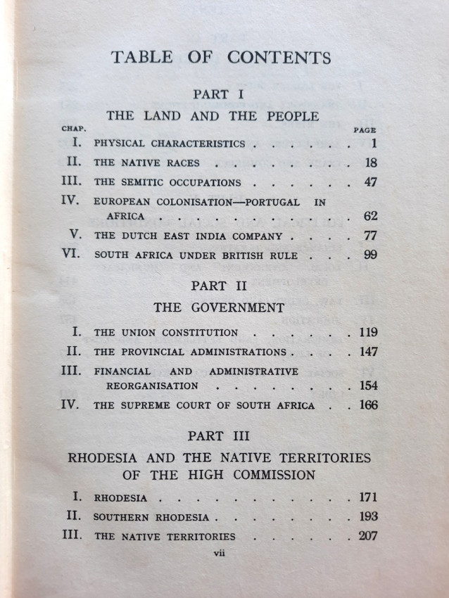 Part I - "The Land and the People" (with chapters: Physical Characteristics; The Native Races; The Semitic Occupations; European Colonisation - Portugal in Africa; The Dutch East India Company; South Africa under British rule);