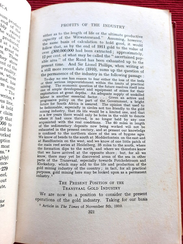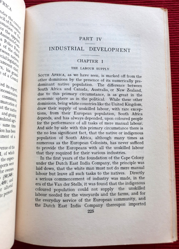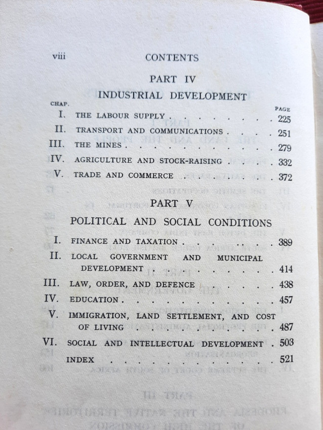 Part IV - "Industrial Development" (with chapters: The Labour Supply; Transport and Communications; The Mines; Agriculture and Stock-raising; Trade And Commerce);