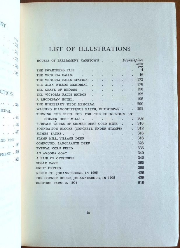 "For the gift or loan of official papers, used in the preparation of this book, the author desires to express his grateful thanks to the High Commissioner for the Union of South Africa (The Hon. Sir Richard Soloman, G.C.M.G.) and J. R. Stopford, Esq., of the High Commissioner's Office; the British South Africa Company; the Rhodes Trustees; the Central Mining and Investment Corporation, Ltd.; and the Town Clerk of Johannesburg (J. Taylor, Esq.)." (From the "Note" by the Author)