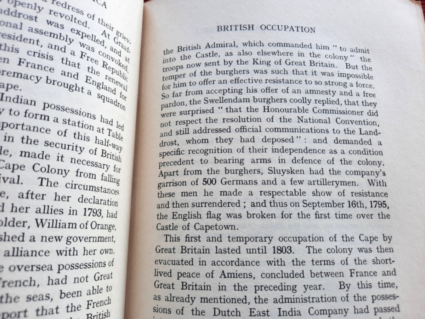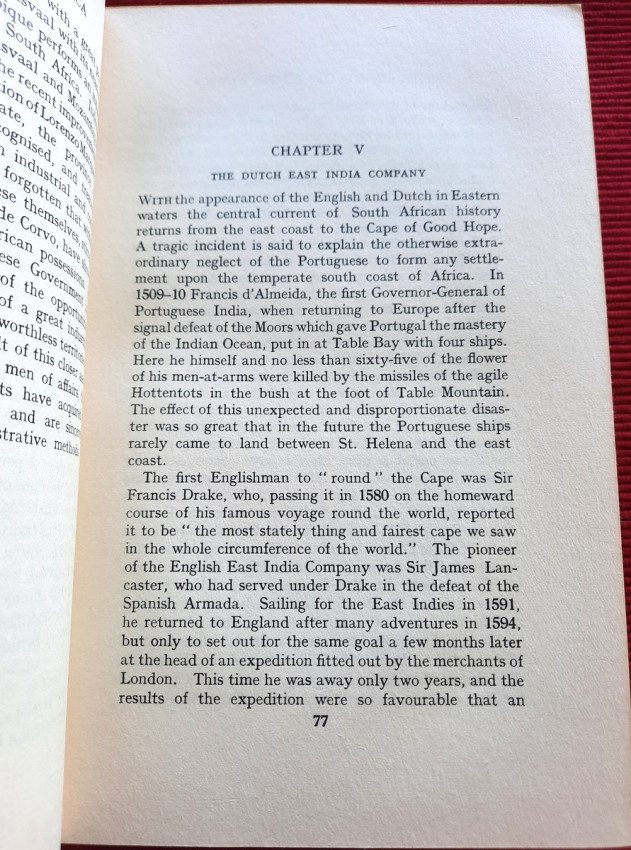 The chapter "The Dutch East India Company" contains sections of The Cape Settlement, The Company's System, The Hottentot Question, Huguenot Immigration, The Boer Stock, Origin of the "Taal", Growth of the Settlement, Condition of Colonists, Position in 1795, and British Occupation.