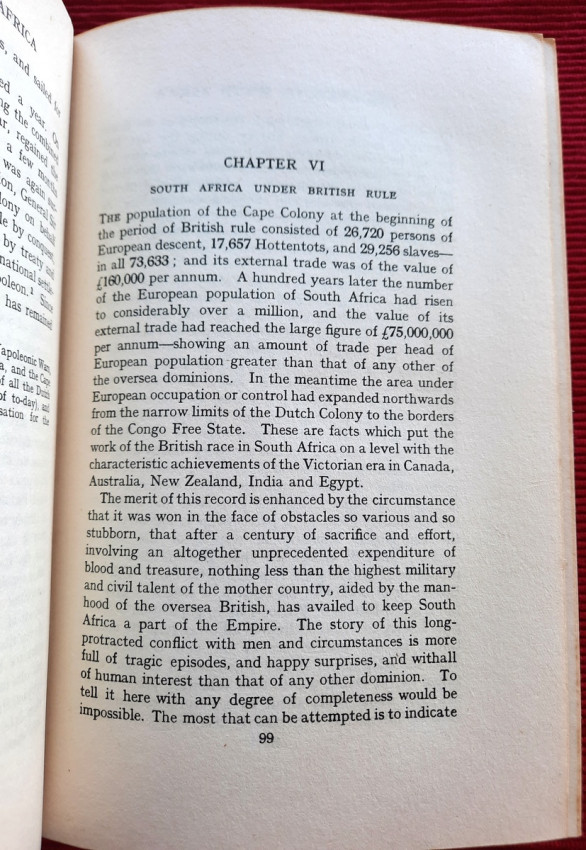 The chapter "South Africa under British Rule" contains sections of Exceptional Difficulties, British Policy, Abolition of Slavery, The Great Trek, The Boer Republics, Natal Retained, Industrial Progress, Discovery of the Rand, and The Great War.