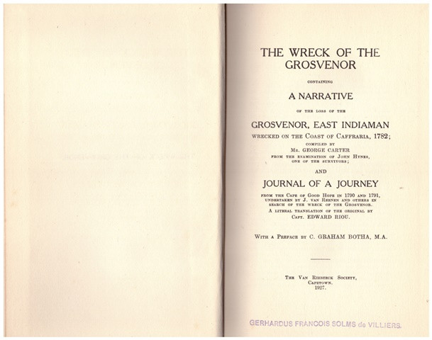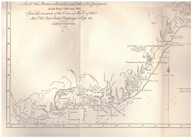 Stephen Taylor, in THE CALIBAN SHORE (2004, p. 264), describes this book as a key publication on the wreck of The Grosvenor. Carter was a painter who heard the story en route to India. His painting career failed on the sub-continent, but his account of the wreck published in 1791 was a best seller. Jacob van Reenen was a member of a twelve man expedition under J.A. Holtshausen who were sent to search for survivors. Captain Edward Riou was a Royal Navy officer who joined the navy at twelve. He served under Captain James Cook and was killed when in charge of a frigate squadron at the battle of Copenhagen.