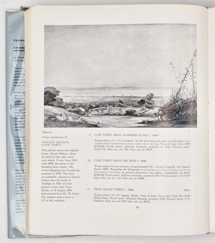 First Edition: 318 pages, frontispiece portrait, folding colour facsimile of Bowler's painting "Arrival of the East Indiaman St. Lawrence in Table Bay" tipped onto front free endpaper, numerous colour and black & white plates, light blue cloth with some light insect scarring, a good copy in the dust jacket which is foxed on the upper cover.