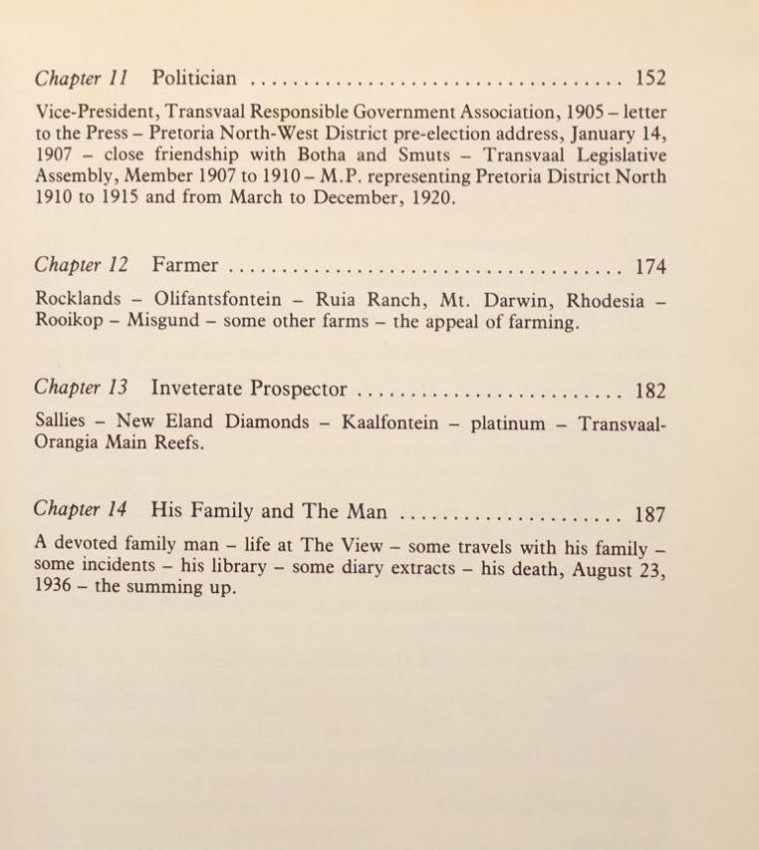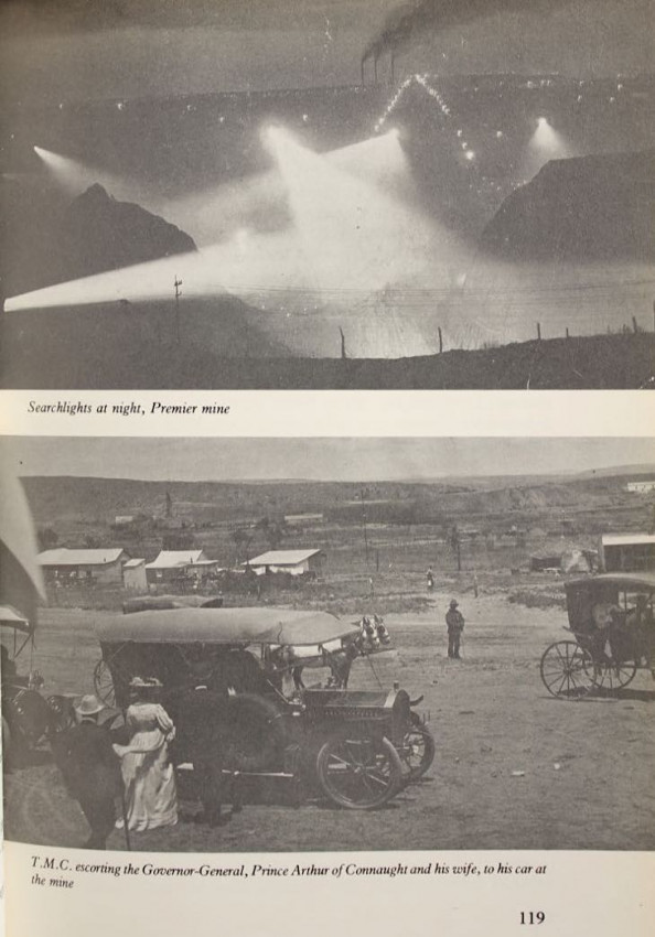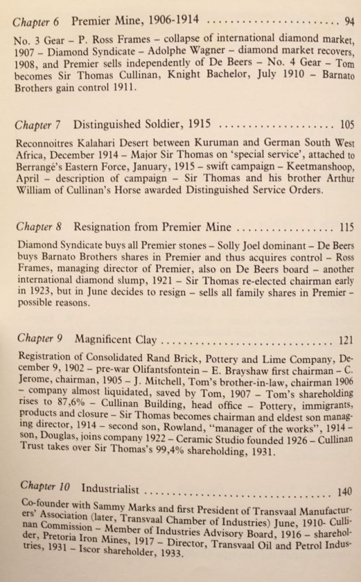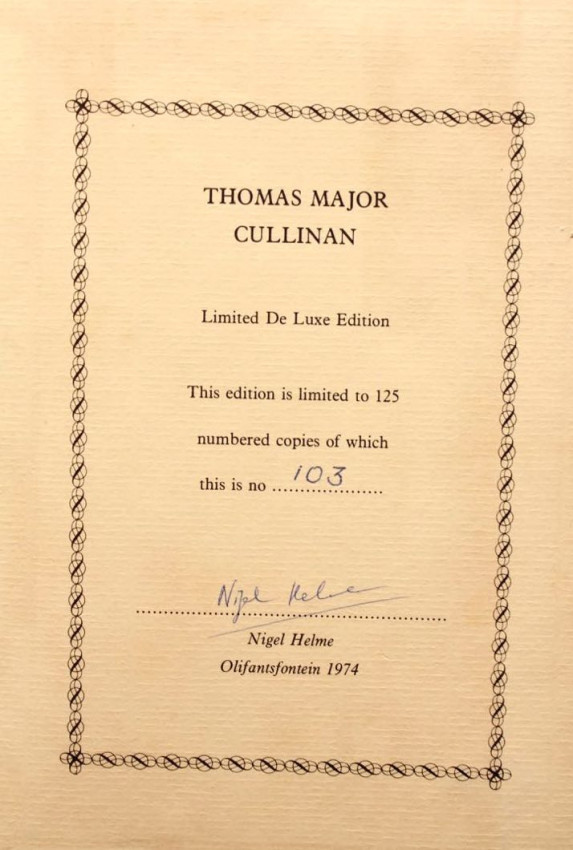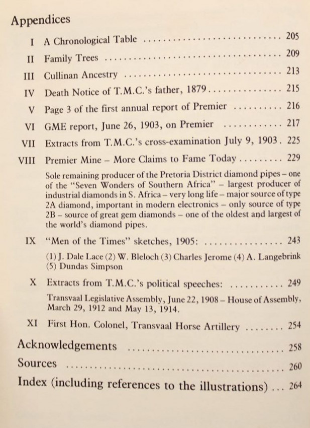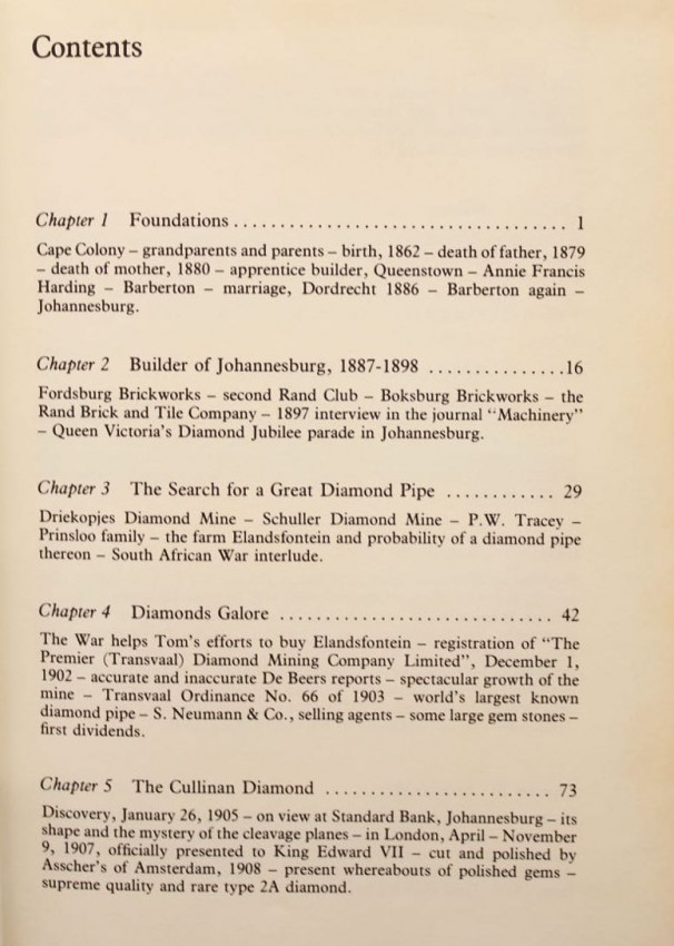 'Far too little has been written about the life of Sir Thomas Cullinan and the Premier Mine, and much that has been written is inaccurate. Nigel Helme here sets out to rectify matters, and he succeeds admirably. For the first time the full, fascinating story, probably as accurate as it will ever be, of the pre-Boer War discovery of diamonds east of Pretoria and of the several diamond pipes and mines in the area is told. Here, too, the myth is exploded of Oom Prinsloo, sitting on his stoep, clutching his rifle and threatening death to any trespasser on his property. Then there is the revelation that Government officials, as well as Cullinan, had a shrewd idea before the War of the existence of the great pipe. The strain of having to wait for four years until Cullinan was enabled to buy the property from the Prinsloo family is brought out clearly. The story goes on to show, by actual quotes from a secret agent's reports, how a few influential De Beers' men were led to believe, for almost a year after the opening up of the pipe, that it was of little importance. Helme then traces the spectacular growth of the mine through to the acquisition of control first by Solly Joel's Barnato Brothers and then by De Beers. A most interesting summary of the Premier Mine's exceptional claims to fame appears in the Appendices. The diamond story, including a separate chapter on the great Cullinan stone itself, is enhanced by many historic photographs. The photographs of some of the splendid buildings erected by Cullinan, the contractor, in Johannesburg's Market Square in the 1890's are of particular interest. Thomas Major Cullinan was born in the Eastern Cape during the Kaffir Wars, orphaned at 18, trained as a building contractor and was geologist and prospector by inclination. He married Anne Harding in 1886 - she bore him 10 children and was his life-long support and closest friend. He was a devoted family man, farmer, industrialist, politician and patriot. Sir Thomas should be remembered not only for the famous Cullinan diamond and mine, but also as an outstanding South African pioneer.' - editor's note