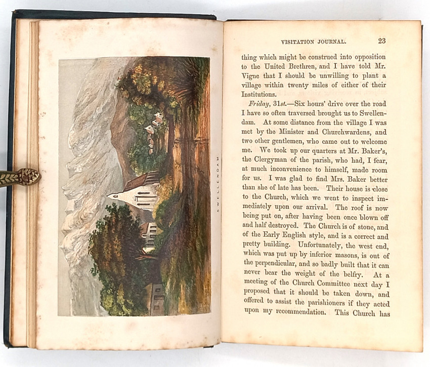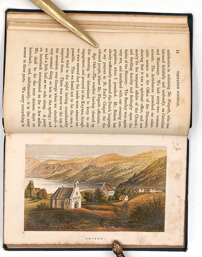 Mendelssohn (Sidney) South African Bibliography, volume 1, page 628, 'During the time that had elapsed between this tour and those recorded in the previous volume, the diocese of Cape Town had been considerably diminished in size by subdivision, resulting in the establishment of the Graham's Town and Natal Bishoprics. Considerable advancement appears to have been made in Church matters during this period, though lack of money still prevailed, and some of the churches were as yet unfinished owing to the scarcity of funds. The tour occupied a period of three months, and included visits to Swellendam, Knysna, George, and many other districts. The account of the visit of Tristan D'Acunha is very interesting, but the inhabitants seem to have been in poor circumstances, and most of them were desirous of leaving; only a small portion of the island was habitable, and even in this small area the ground had already become impoverished.'