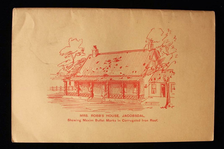 Publisher's stapled booklet with illustration of "Mrs Robb's House, Jacobsdal, Shewing Maxim Bullet Marks in Corrugated Iron Roof" on the back cover.