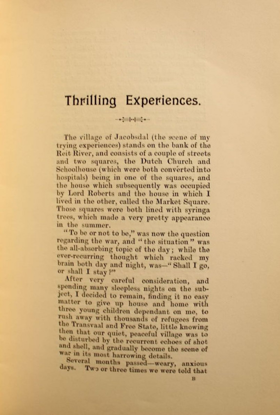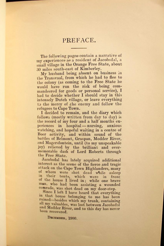 'A diary of four and half months spent in Jacobsdal, Orange Free State, during the South African War. Jacobsdal is a small village in the Orange Free State about thirty miles south-east in Kimberley. Her husband, away on business and unable to return to the Free State for fear of being commandeered for goods or personal service, Mrs Robb decided to stay in what she describes as 'this intensely Dutch village.' Although not trained, she volunteered at the local hospital as a nurse and attended the wounded - Boer, British and African. She comments interestingly on life in the town during the occupation by the Boer forces and upon her work in the hospital which, for some of the time, was taken over by a German ambulance which she describes as being 'fully equipped with all the latest improvements.' The hospital received wounded from the major battles which took place in the area including Magersfontein.'