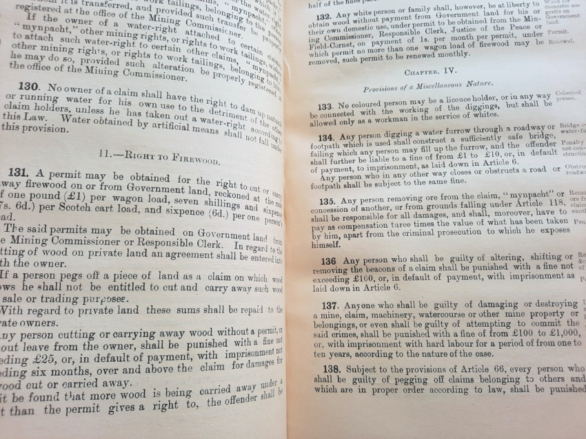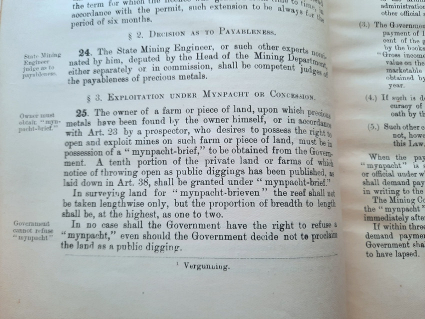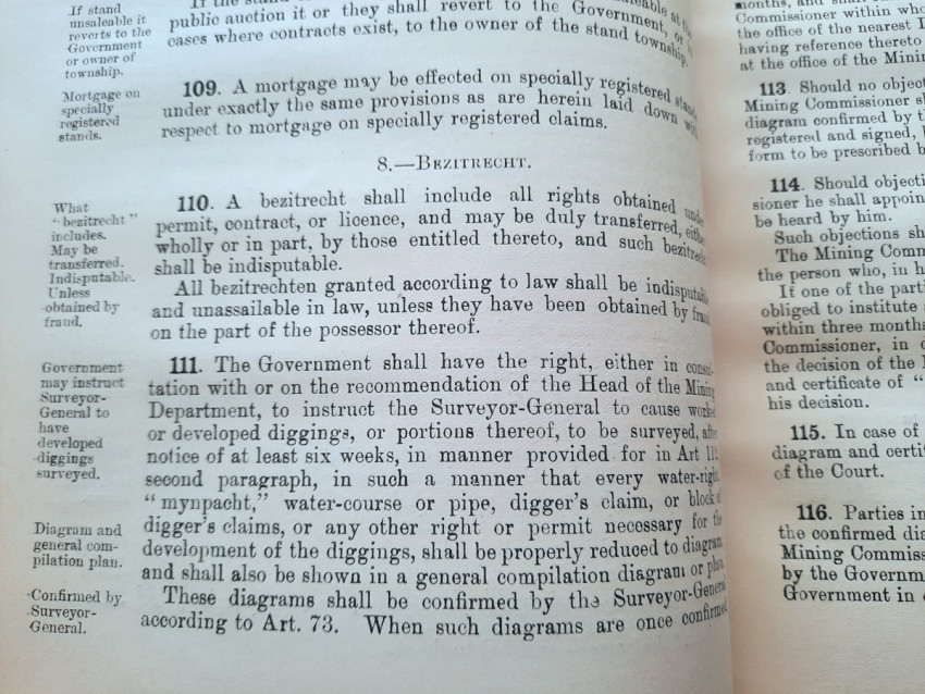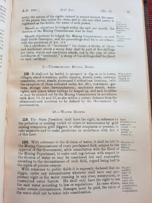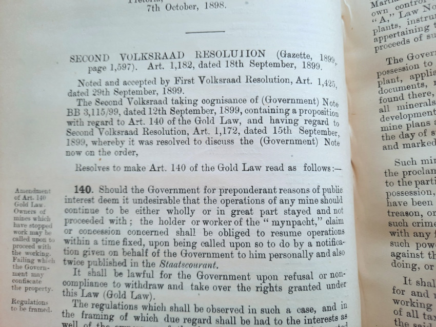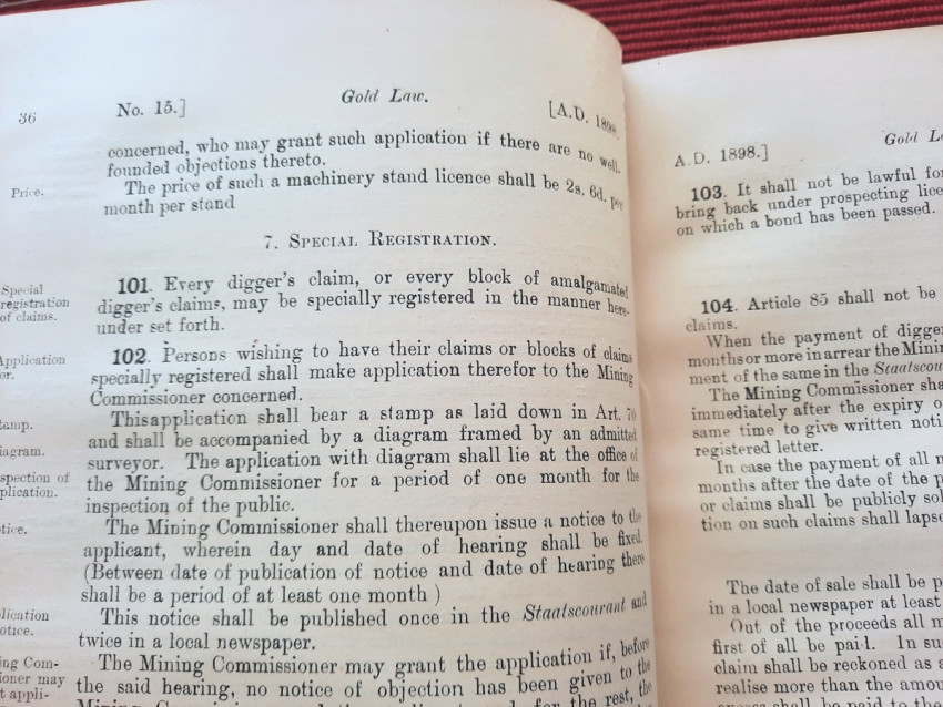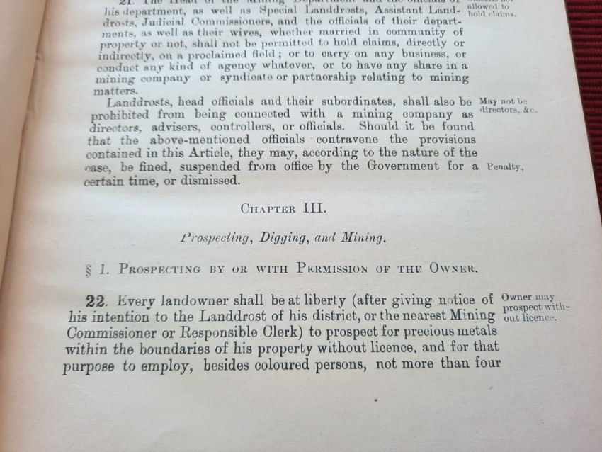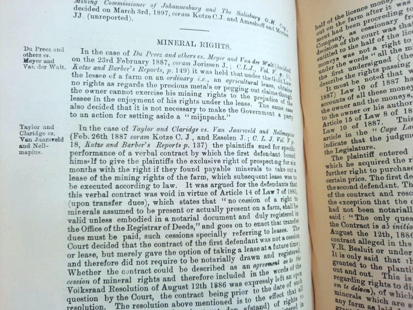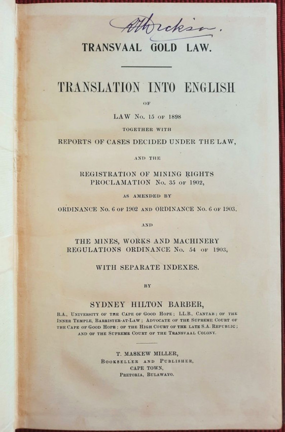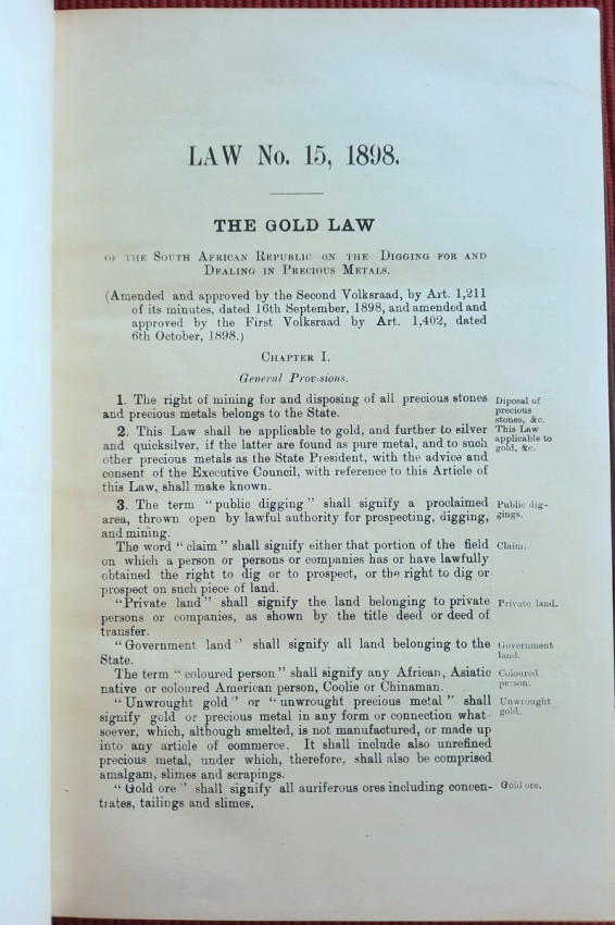 A scarce collection of mining laws including a translation into English of the Law No.15 of 1898 with reports of cases, Registration of Mining Rights of 1902, Mines, Works & Machinery Regulations from 1903, etc.