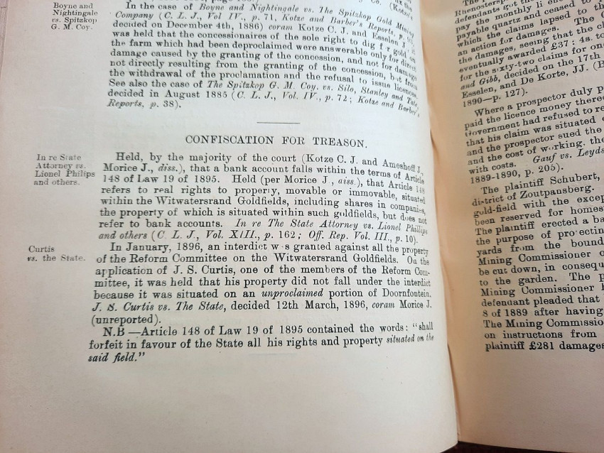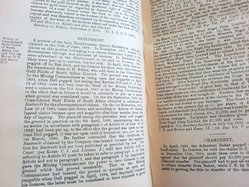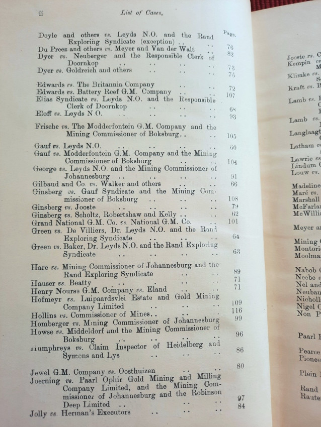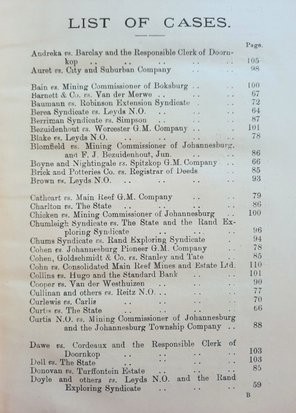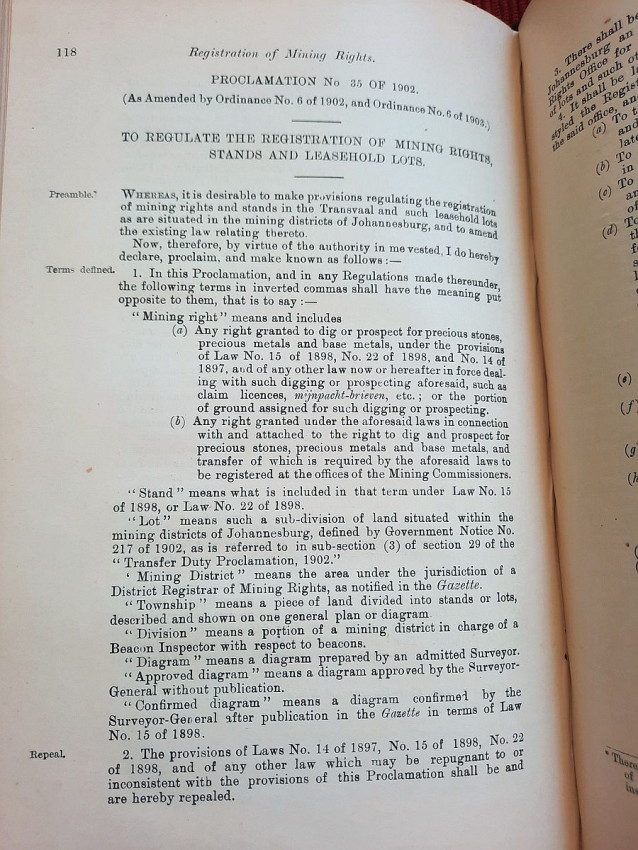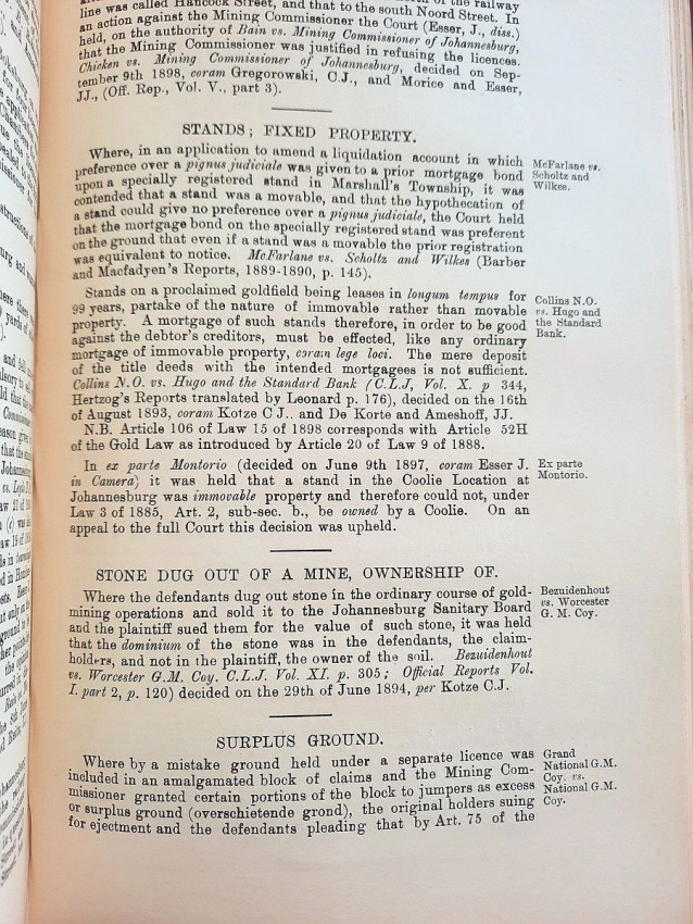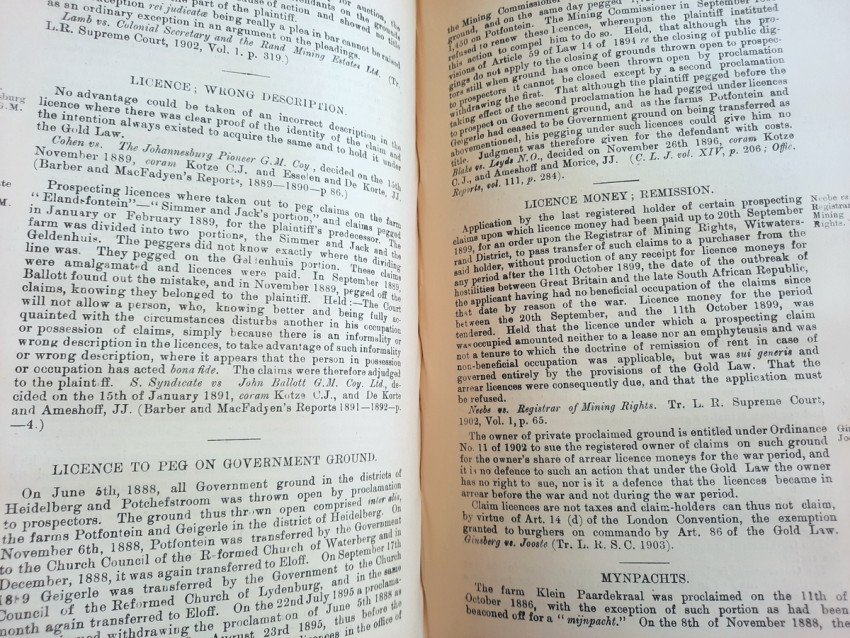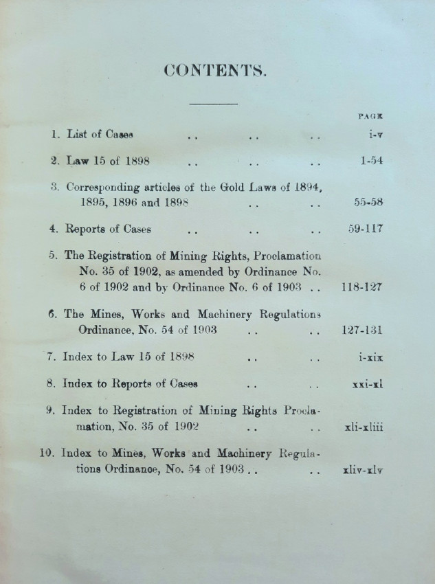 In addition to the old Gold Law, No. 15 of 1898, and the Reports of Cases decided under it, the text is given of the Regis tration of Mining Rights Proclamation, No. 35 of 1902 (as amended by Ordinance No. 6 of 1902, and by Ordinance No. 6 of 1903), and the Mines, Works and Machinery Regulations Ordin- ance, No. 54 of 1903.