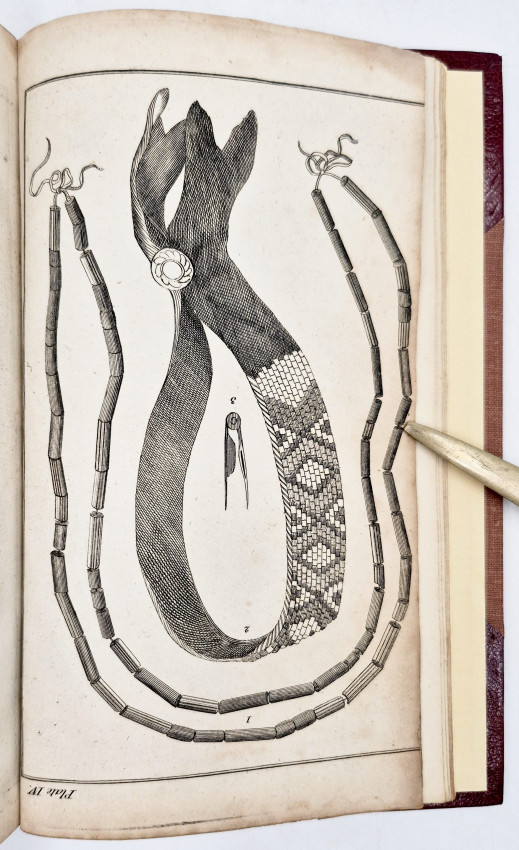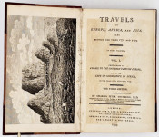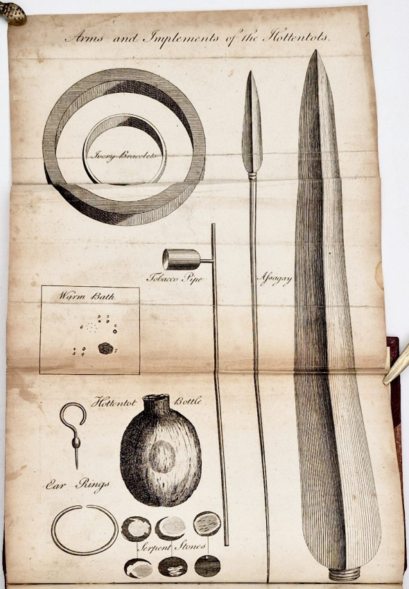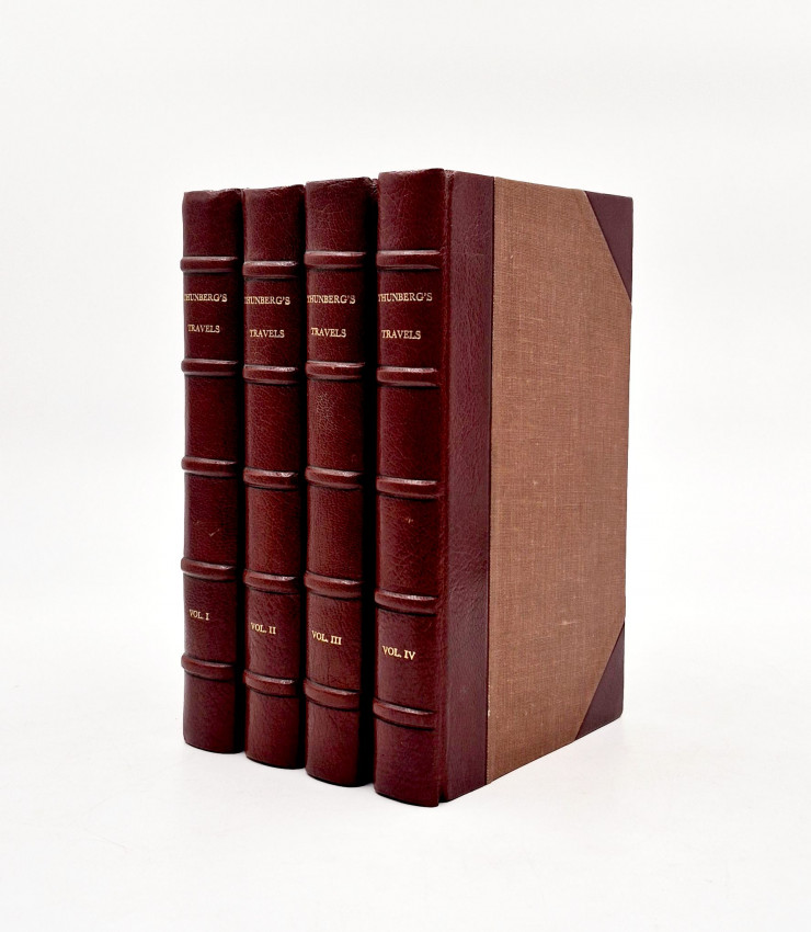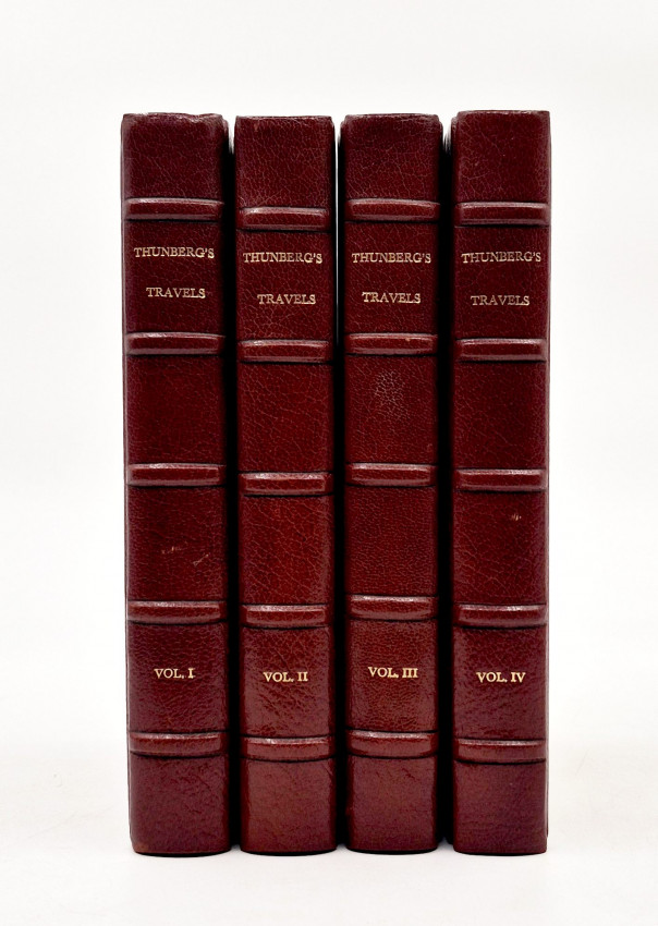 Third Edition: 4 volumes: I. 317, [xviii index]; II. [xiv], 316; [xvi index], [I directions to the binder]; III. xiii, 285, 31 pages of vocabulary of the Japanese language, [xv index]; 1V. xix, 293, [xvi index], [ii] publisher's advertisement; pages, 11 plates including: engraved frontispiece in volume I and 2 other plates – 1 folding (Arms and Implements of the Hottentots), 4 plates in both volumes 2 & 4 each with a one-leaf explanation of the plates, half brown morocco with matching brown cloth sides, a very good set.