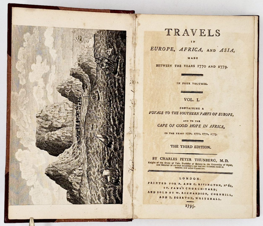 Mendelssohn (Sidney) South African Bibliography, volume 2, page 500, 'The greater part of the first volume and about half the second are devoted to Thunberg's experiences in South Africa, his botanical notes being of special value. Later on he visited Japan, Ceylon and other places.'