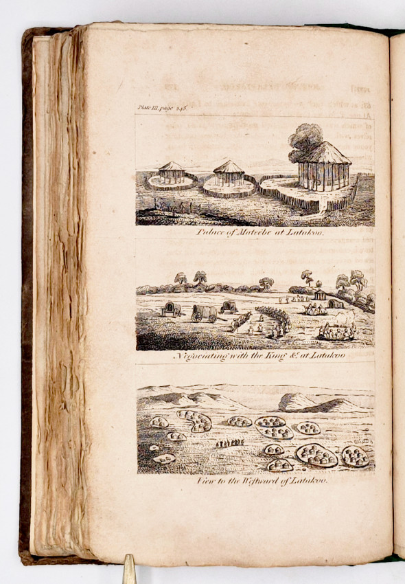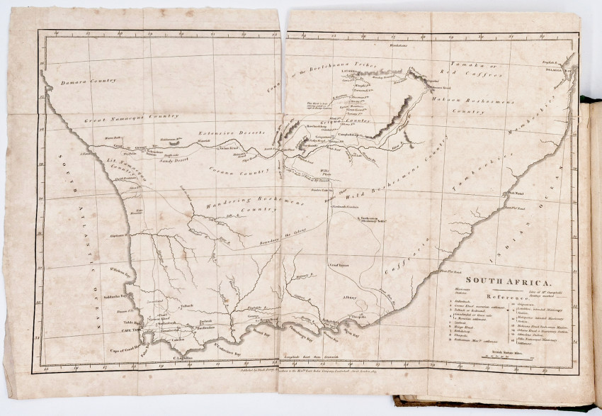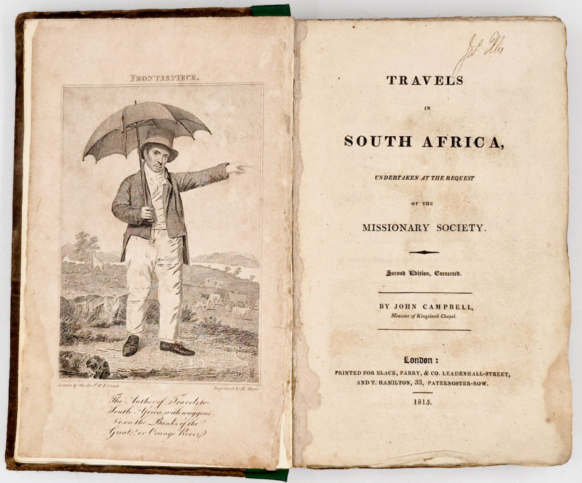 Dictionary of South African Biography, volume 3, pages 127-8: ‘Upon the death of Dr J.T. van der Kemp the London Mission Society sent Campbell to South Africa to visit and report on their mission stations. Campbell was the first missionary traveller to undertake a long journey into the interior, visiting far-flung missions. From Bethalsdorp he went to Graaff Reinet where he met the traveller W.J. Burchell. Finally after crossing the Orange River he reached Klaarwater mission station and advanced to Lattakoo and beyond, north-west of Malapeetze. When he was returning from this first journey of 4,800 kilometres, Campbell followed the South Bank of the Orange River for 960 kilometres, 480 kilometres on foot, in a region little known to Europeans. Having reached Pella he turned south via Silwerfontein where Cornelius Kok lived and where he received valuable information about Namaqualand, Damaraland and the Bushmen. He also brought back natural history and geological specimens for the L.M.S, museum.'