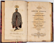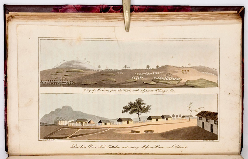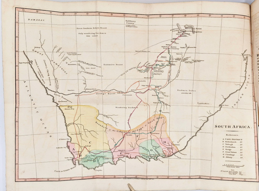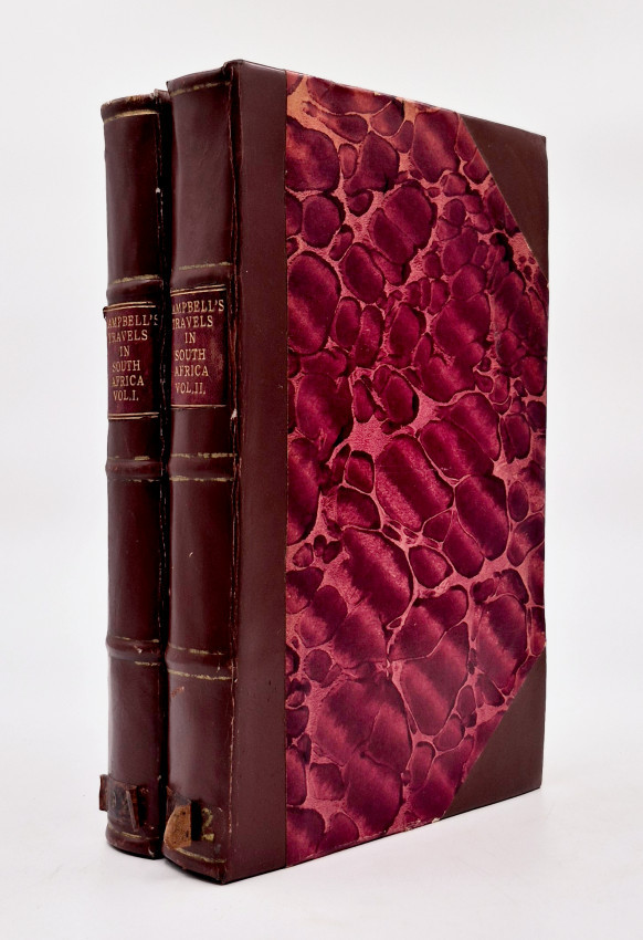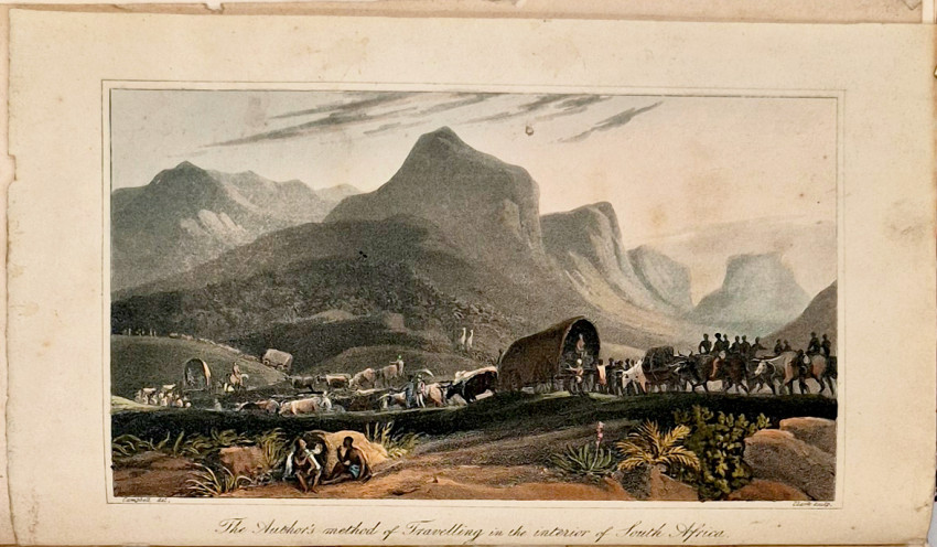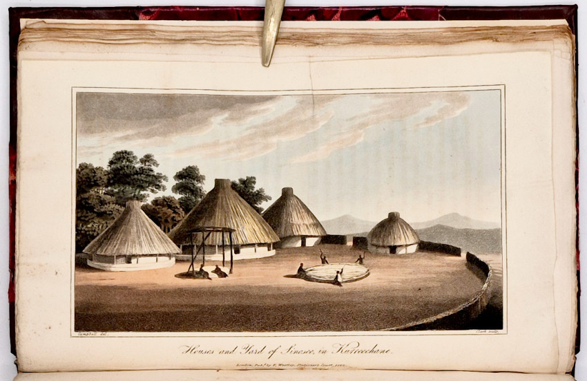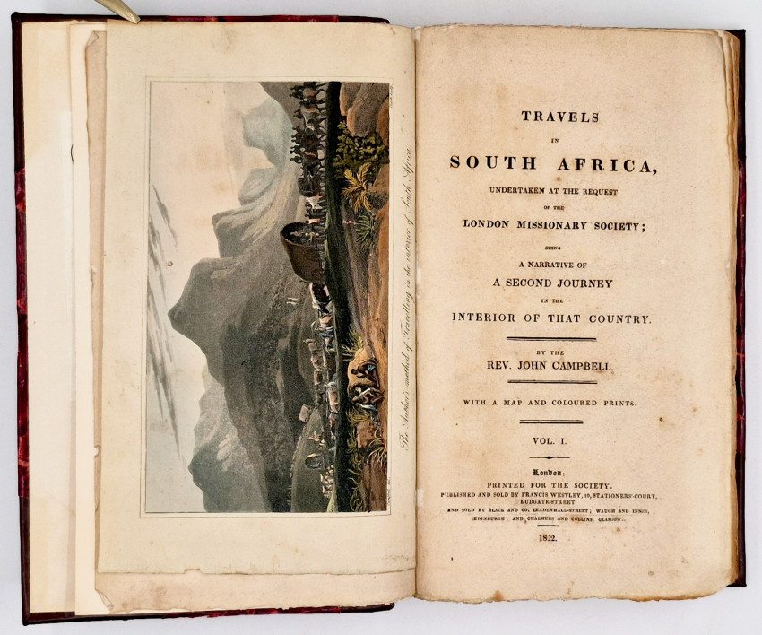 Dictionary of South African Biography, volume 3, pages 127-8: ‘Upon the death of Dr. J.T. van der Kemp the London Mission Society sent Campbell to South Africa to visit and report on their mission stations. Campbell was the first missionary traveller to undertake a long journey into the interior, visiting far-flung missions. From Bethalsdorp he went to Graaff Reinet where he met the traveller W.J. Burchell. Finally after crossing the Orange River he reached Klaarwater mission station and advanced to Lattakoo and beyond, north-west of Malapeetze. When he was returning from this first journey of 4,800 kilometres, Campbell followed the South Bank of the Orange River for 960 kilometres, 480 kilometres on foot, in a region little known to Europeans. Having reached Pella he turned south via Silwerfontein where Cornelius Kok lived and where he received valuable information about Namaqualand, Damaraland and the Bushmen.