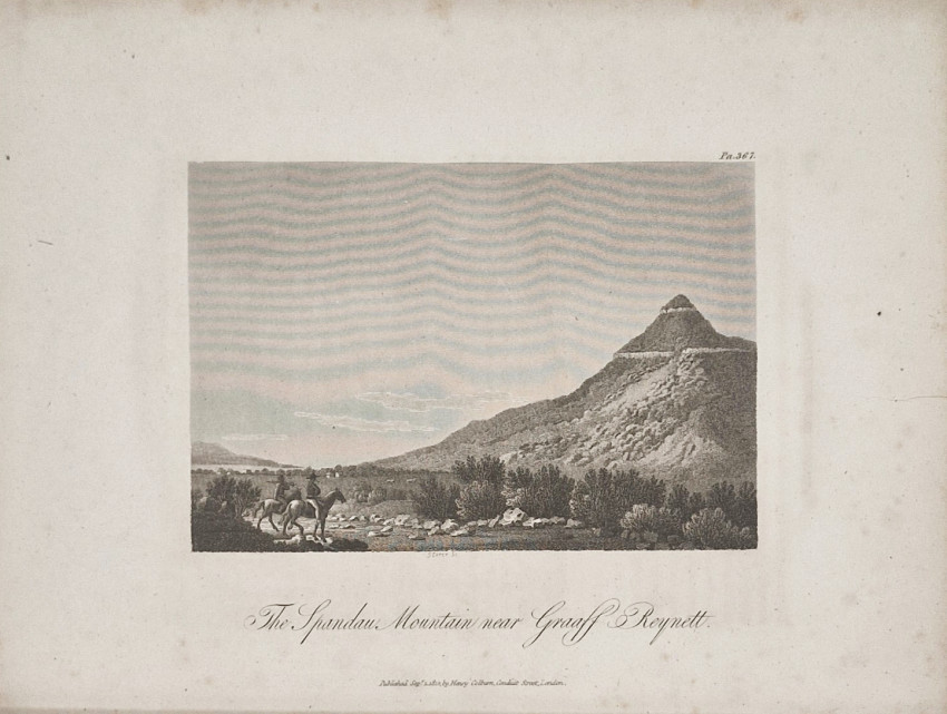 'Lichtenstein remained in South Africa for just over three years and undertook several journeys into the interior. In addition to his own observations he had access also to the journals kept by General Janssens and Commissary-General Jacob de Mist. In October 1803 he set out with de Mist and a large party on a six months tour of the colony. They first travelled north to Saldanha Bay and the mouth of the Berg River, then eastwards round the Piketberg, through Piekenierskloof to the Olifants River valley, passed north of present Calvinia, through the Roggeveld, and on to Roodezand (now Tulbach) on 20 November. Near Calvinia he saw the impressions of what he described as "eel fish" in the sedimentary rock, but these were probably trace fossils - markings left by living organisms rather than the organisms themselves. From Tulbagh they set off for the eastern frontier. During several days at Swellendam he collected plants and insects in the Duiwelsbosch forests, as well as seeds for the Cape Town botanic garden. Continuing along the coast to Knysna the party crossed the mountains where Prince Alfred Pass is now and travelled down the Langkloof, reaching Algoa Bay on 7 January 1804. They then proceeded north-eastwards to the Fish River and after failing to meet Chief Gaika returned through the Karoo and the Hex River Pass to Cape Town, which they reached on 23 May. Lichtenstein collected many natural history specimens during the 3000 km trip, and made detailed notes on the colonial mode of life.
