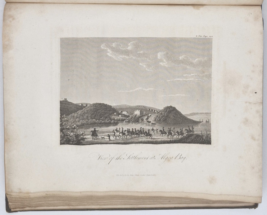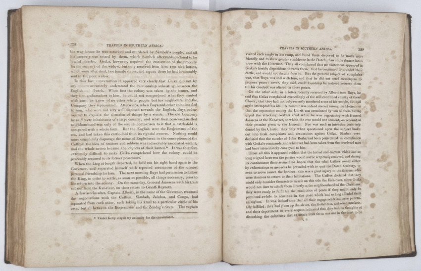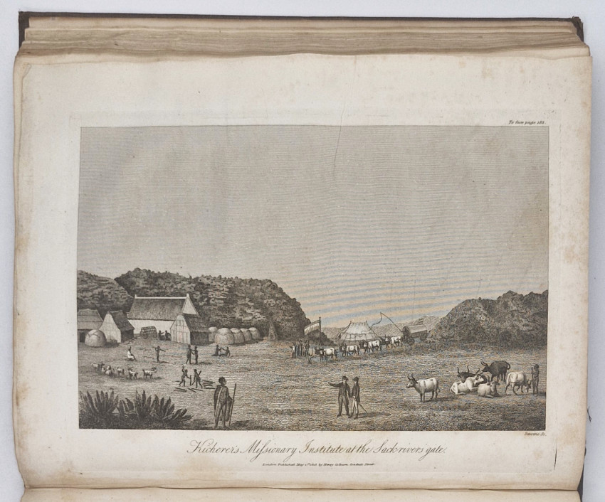 First Edition: Two volumes: I. xii, 183, (xxxi appendix and index). II. xiv, 368, (xxvii appendices and index) pages, folding map, engraved frontispiece portrait of the author in volume I, 8 engraved plates – 2 folding (the folding plate in volume II 'A View of the Karree Mountains with Ostriches and Quaggas' is the frontispiece), early grey cloth boards rebacked with matching cloth and new leather title labels gilt, most of the signatures (4to and thus eight pages each) are unopened and never read, commonly two sections in volumes I - (pages 225-232 (Signature Gg) & 329-346 (Signatures Uu & Xx) are heavily foxed but in this copy signature Gg is not foxed but signatures Uu & Xx are foxed as usual. There is some browning of the text in both volumes but generally the contents are in better than usual condition. A very good copy.