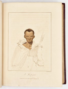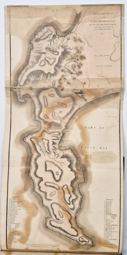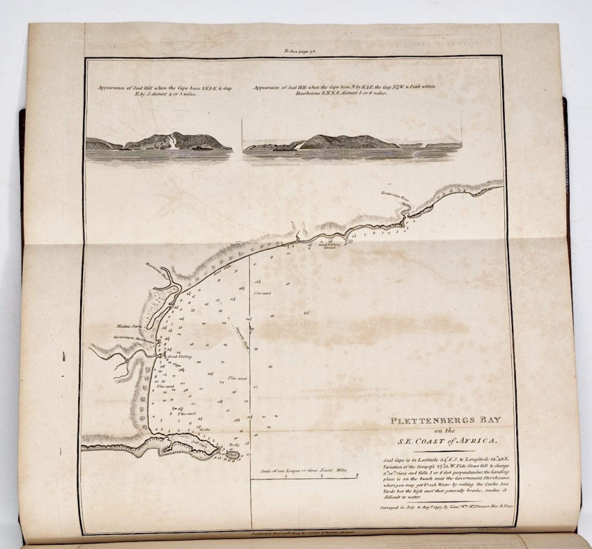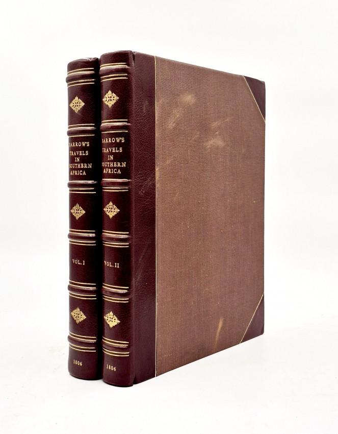 Second (and best) Edition: 2 volumes, xvi, 427 + 372 pages, 8 hand-coloured aquatint plates by Samuel Daniell, large folding map coloured in outline, 8 folding charts and plans 2 of which are hand-coloured -the usual off-setting on the two hand-coloured charts in volume II, the charts have been repaired and strengthened at the folds, the contents are clean and free of foxing and the Daniell plates are bright, bound in half dark brown morocco with matching brown cloth sides, marbled edges, a very good set.