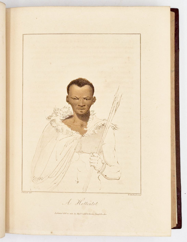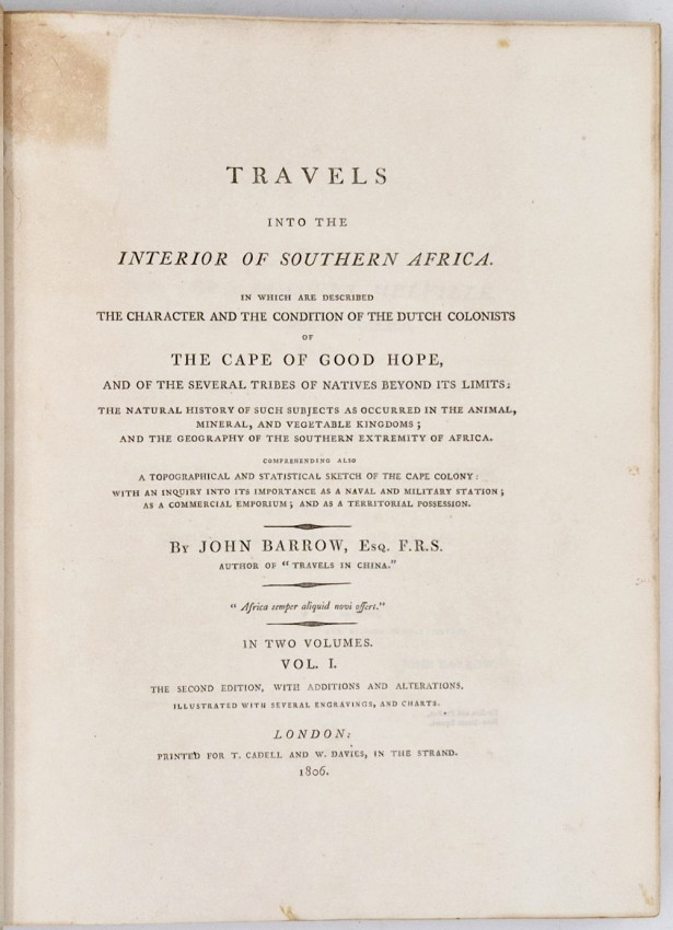 Mendelssohn (Sidney) South African Bibliography volume 1, pages 87 - 88. 'Barrow was attached to the staff of the Earl of Macartney, one of the governors of the Cape Colony during the first occupation by the British. Barrow accompanied an expedition from Cape Town to Graaff-Reinet, and another to Namaqualand, and he gives an excellent description of the country traversed, particularly with regard to the botany and zoology of these regions. He provides significant evidence of the alleged brutality of the Boers to their slaves and Hottentot servants, and there is a description of the characteristics, habits, and customs of the various native races. The second volume deals with the importance of the country from a military and naval perspective. The plates by Daniell are not present in the first edition.'