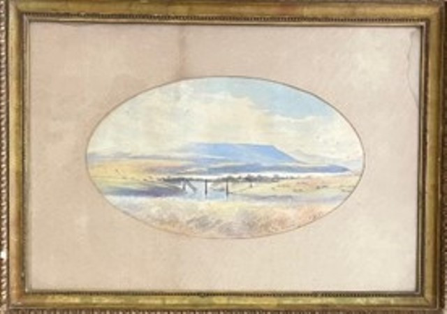 Framed watercolour painting with glass. Small chips to edges of frame. 18 x 31 cm [oval painting]; 35 x 50 cm [frame]. Framer's ticket on rear: "Combridge Limited, 18 & 20 Grafton Street, Dublin". King's annotations along the bottom of the painting names the views and indicates the exact locations from which he painted the scene. From left to right: Grobelaar's Kloof; Tugela; Grobelaar's Hill, and Tugela Heights. Signed & dated by King on lower right hand side.