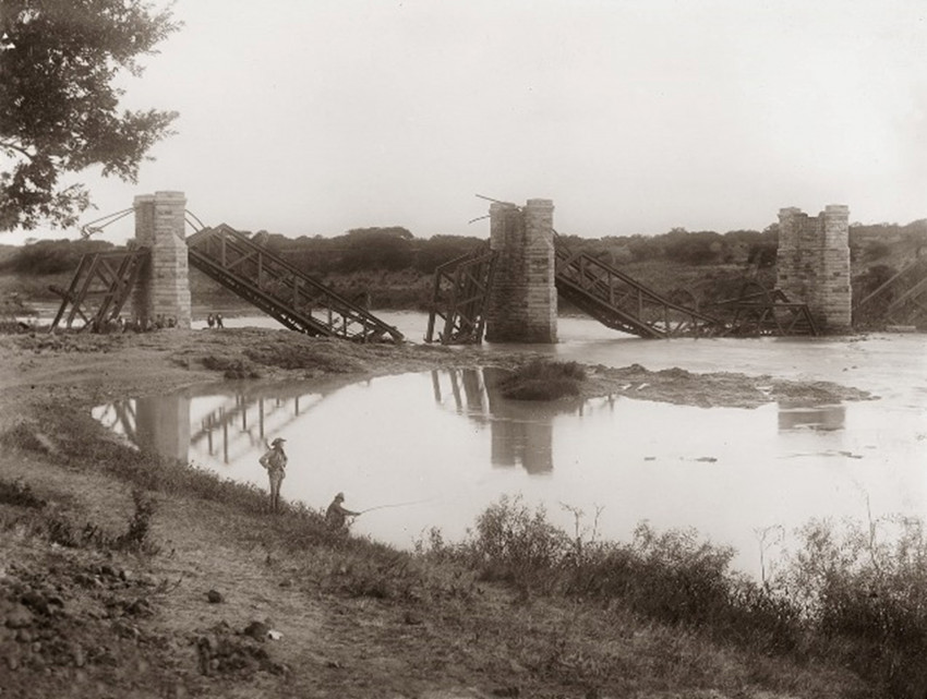 The Colenso railway bridge was blown up by Boer forces on the night of 28 November 1899 to disrupt British troop movement (see Maurice and Grant, vol. 1, p. 273 and Amery, volume 2, p. 318). King (1864-1939) was born in Cornwall and moved to Natal where he worked as an engineer. In Artists... of the Anglo-Boer war, (p. 157), Ryno Greenwall credits him with over 20 paintings of Natal battlefield sites.