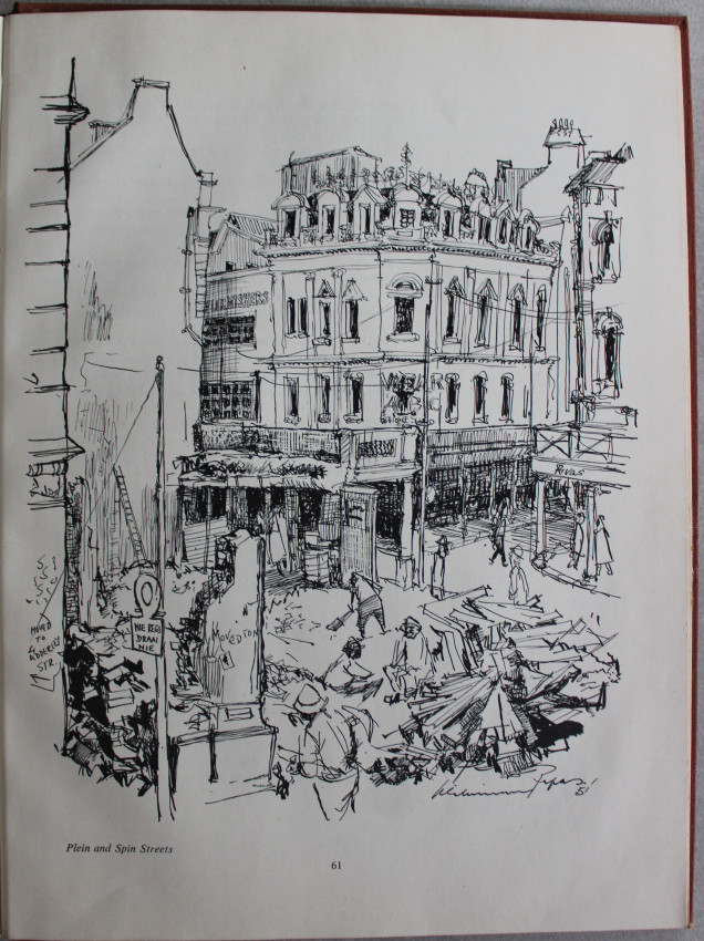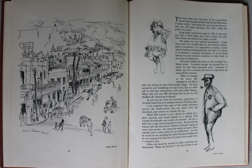 Includes visits and sketches to the Malay Quarter, Old Supreme Court, Wale & Bloem & Long & Plein streets, Parliament, the Gardens & Parade & Castle, Michaelis Art Gallery, Lutheran Church, Fish Market, District Six, Kalk bay, Simonstown, Hope and Roeland Streets.