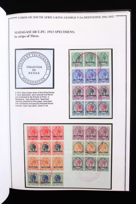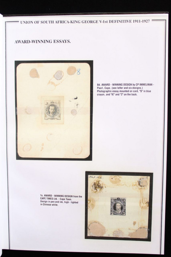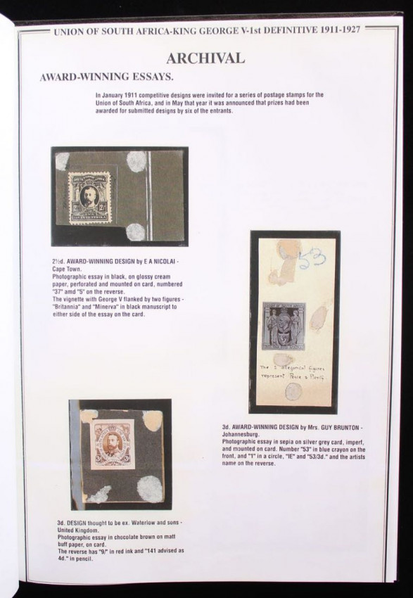 Exhibition catalogue, compiled by J. Fine, showcasing the logical progression from the 1911 Competition through all the relevant Archival material, Plate Numbers and Varieties with the proving pieces and explanations, from the perspective of De La Rue, the printers.