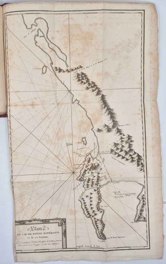 'Count Louis M. J. O. Degrandpre, naval officer and slave trader, was involved in the slave trade during the 1780s, commanding a ship that carried slaves from the west coast of Africa to Mauritius. In 1792 he landed an illegal cargo of slaves infected with smallpox on the island. This may have caused the smallpox epidemic which ravished the island that year and caused the Colonial Assembly of Mauritius to put a price on his head. Returning to England to support the royalist cause in France, he appears to have spent some ten months at the Cape during 1793. During this time he spent 18 days on Robben Island, and travelled northwards as far as the mouth of the Berg River, at St Helena Bay, though it is not clear whether he went by land or sea. He returned to France in 1799, and in 1801 published three books. One was a French translation of John Barrow's Travels into the interior of southern Africa..., with notes and criticisms. The second was an account of his exploits in the Indian Ocean, an English translation of which appeared in 1803, titled A voyage in the Indian Ocean and to Bengal, undertaken in the years 1789 and 1790; containing an account of the Seychelles Islands and Trincomale.... The third was his Voyage a la cote occidentale d'Afrique, fait dans les annees 1786 et 1787.... The second volume of this work is largely devoted to a description of the Cape. The accompanying maps and illustrations include a plan of the Castle in Cape Town, and a map of the Cape of Good Hope and its surroundings. The map does not contain much detail, while Saldanha Bay is somewhat distorted and shown too far south.