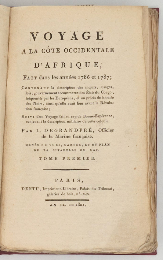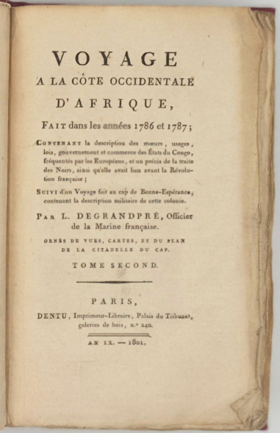 Mendelssohn (Sidney) South African Bibliography volume I, pages 431/2, 'The first volume deals mainly with Angola, Loango, Malembe, Canbende, and other countries on the west coast of Africa; while the second volume is, for the greater part, devoted to an account of the Cape of Good Hope at this period. Degrandpre severely criticises the cruelty of the Dutch to the aborigines, and remarks that "they will always have to blush before intelligent people for having destroyed the Hottentot nation, and for repeating in the extreme south of Africa the sanguinary scenes committed by Spain in America." H further says that when the Hottentots could not offer them sufficient victims, they attacked the Bushmen.'