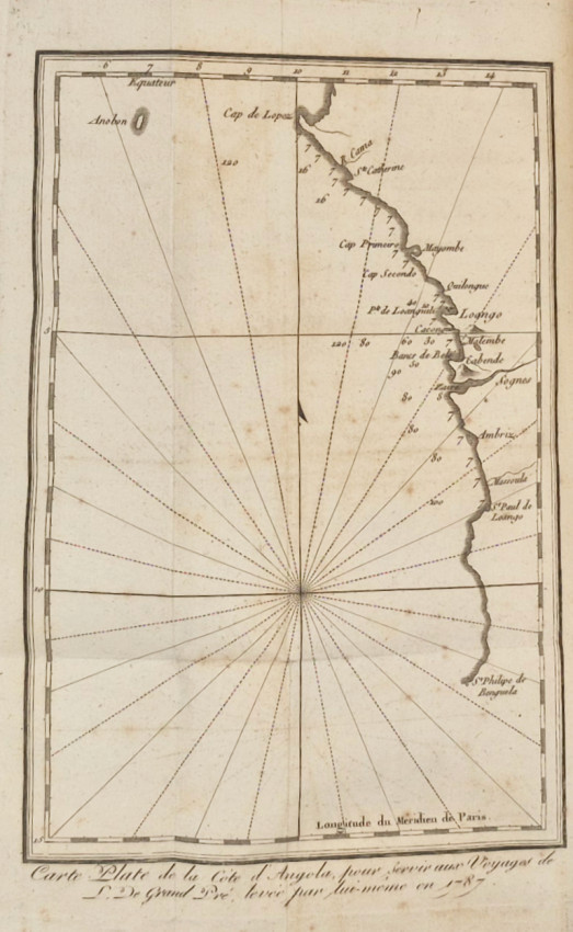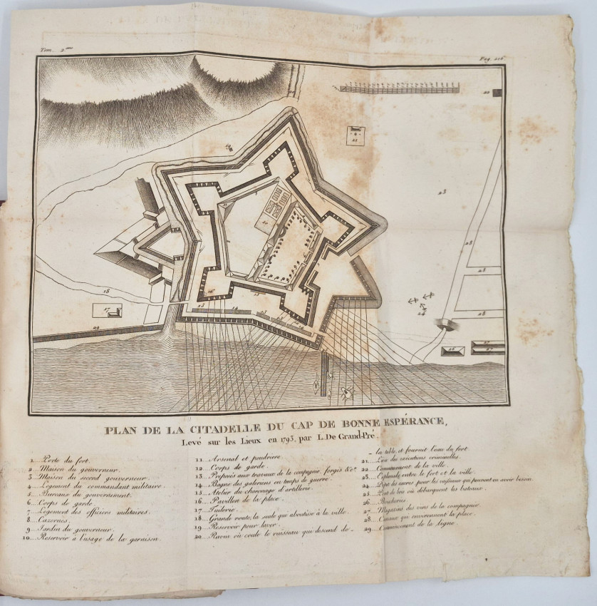 'Count Louis M. J. O. Degrandpre, naval officer and slave trader, was involved in the slave trade during the 1780s, commanding a ship that carried slaves from the west coast of Africa to Mauritius. In 1792 he landed an illegal cargo of slaves infected with smallpox on the island. This may have caused the smallpox epidemic which ravished the island that year and caused the Colonial Assembly of Mauritius to put a price on his head. Returning to England to support the royalist cause in France, he appears to have spent some ten months at the Cape during 1793. During this time he spent 18 days on Robben Island, and travelled northwards as far as the mouth of the Berg River, at St Helena Bay, though it is not clear whether he went by land or sea. He returned to France in 1799, and in 1801 published three books. One was a French translation of John Barrow's Travels into the interior of southern Africa..., with notes and criticisms. The second was an account of his exploits in the Indian Ocean, an English translation of which appeared in 1803, titled A voyage in the Indian Ocean and to Bengal, undertaken in the years 1789 and 1790; containing an account of the Seychelles Islands and Trincomale.... The third was his Voyage a la cote occidentale d'Afrique, fait dans les annees 1786 et 1787.... The second volume of this work is largely devoted to a description of the Cape. The accompanying maps and illustrations include a plan of the Castle in Cape Town, and a map of the Cape of Good Hope and its surroundings. The map does not contain much detail, while Saldanha Bay is somewhat distorted and shown too far south.