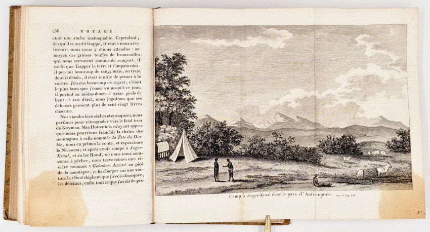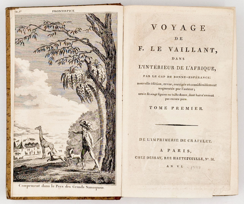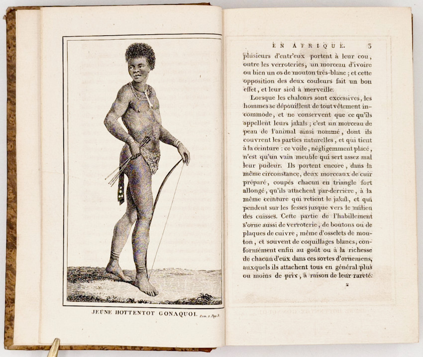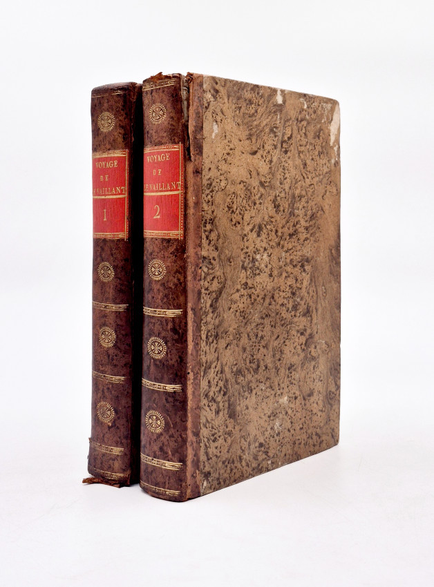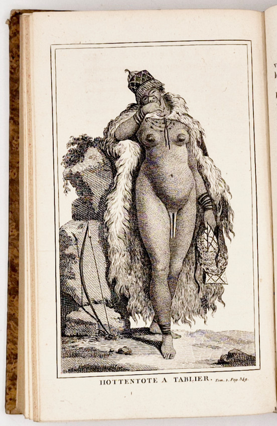 An important edition because it contains Le Vaillant’s final revisions and additions and volume II contains the suppressed plate of Hottentote a Tablier (or Apron - The specific anatomical feature being described is the elongated labia minora.) Publishers often omitted the plate entirely, or censors would physically scratch out or cover the specific anatomical feature on the plate with ink, particularly in copies intended for less scholarly audiences or libraries.