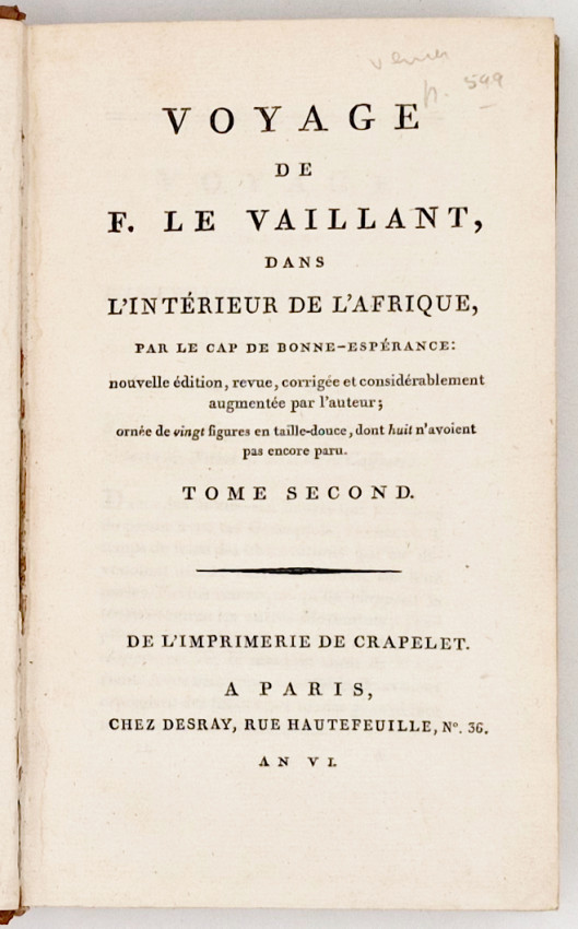 Ogilvie (J.H.) A Bibliography of Le Vaillant's Voyages and Oiseaux d'Afrique (JPL 1962), Number 12, page 11.