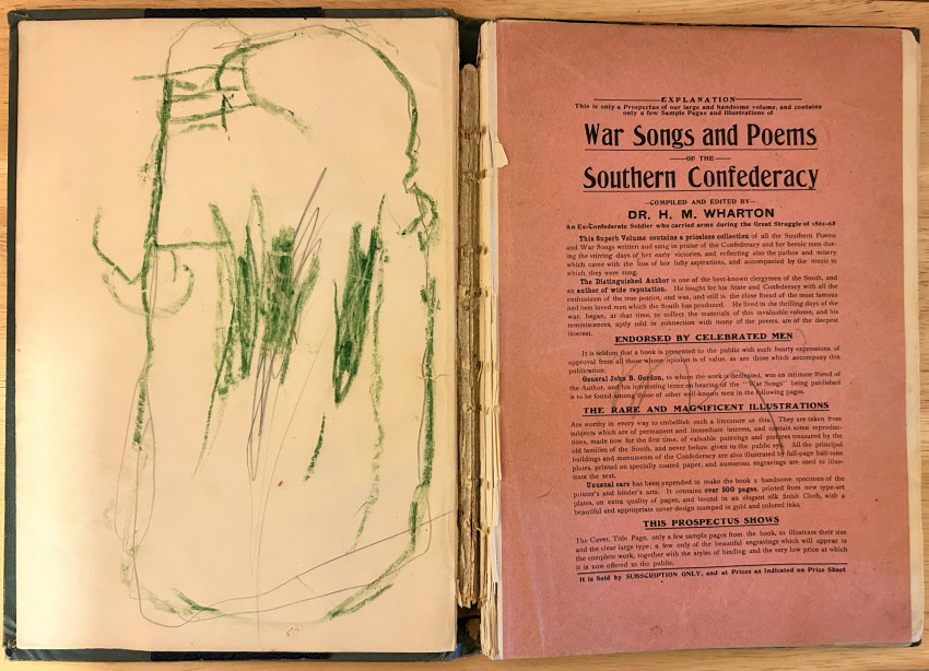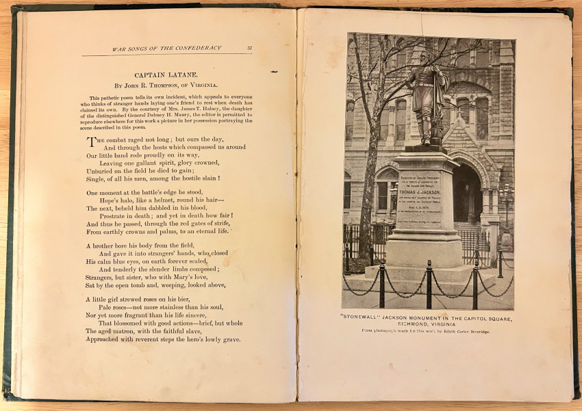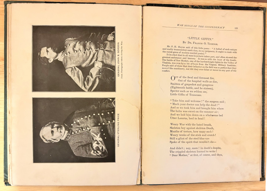 Self described as "This superb volume contains a priceless collection of all the Southern Poems and War Songs written and sung in praise of the Confederacy and her heroic men during the stirring days of her early victories, and reflecting also the pathos and misery which came with the loss of her lofty aspirations, and accompanied by the music to which they were sung"