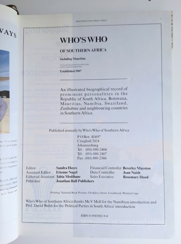An illustrated biographical record of prominent personalities in the Republic of South Africa, Botswana, Mauritius, Namibia, Swaziland, Zimbabwe and neighbouring countries in Southern Africa.