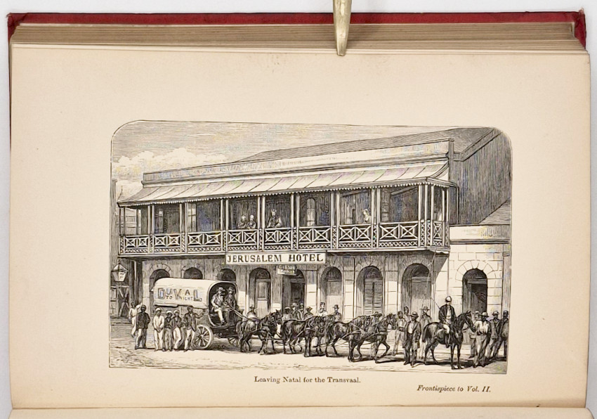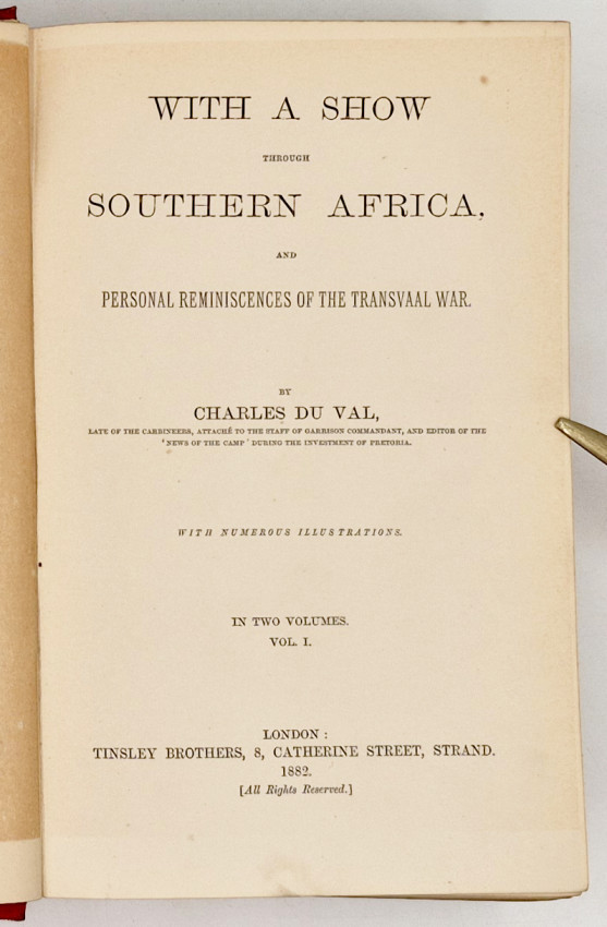 Mendelssohn (Sydney) South African Bibliography, volume 1, page 505: ‘Mr. Du Val Was a well-known entertainer and his visit to the Cape were in connection with his profession. After some stay in Cape Town he pursued his way to the north, and there is an account of the coach journey from Beaufort West to Kimberley, with an animated description of the diamond fields. From Kimberley the author travelled through the Free State and the Eastern Province to Natal, giving a humorous and good-natured account of his adventures, with excellent character sketches of many prominent men encountered by him in his various journeys, amongst whom may be mentioned Bishop Colenso, Alfred Aylward, Sir Owen Lanyon, and Joubert. On his arrival in the Transvaal he found the country on the verge of the rebellion which soon after broke out, and he gives an intelligent account of the existing political situation.