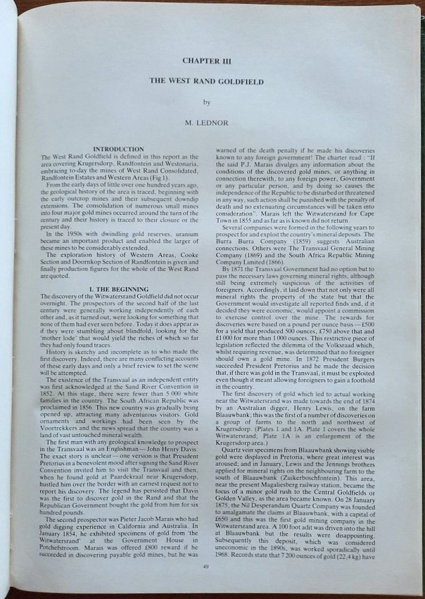III. THE WEST RAND GOLDFIELD (by M. LEDNOR) - (with sections: Introduction; The Beginning; The Industry Takes Off; Robinson, Rhodes, Barnato; Some Early Mines and Incidents on the West Rand; The Evolution of Geological Thought on the West Rand; Geology of the West Rand Goldfield; The Discovery of Western Areas, Cooke and Doornkop; The Mines - Historical Details; Summary of Production Trends for the West Rand Goldfield; Acknowledgements);