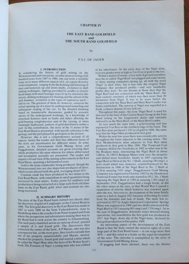 IV. A. THE EAST RAND GOLDFIELD (by F. S. J. DE JAGER) - (with sections: Introduction; Summary History; Stratigraphy and General Geology; Contribution by Geology and Geologists; The Mines - Historical Details);