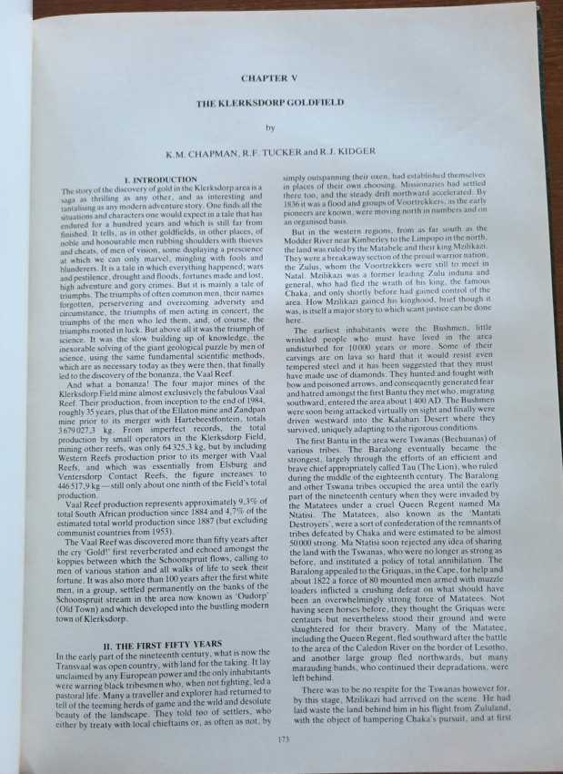 V. THE KLERKSDORP GOLDFIELD (by K. M. CHAPMAN, R. F. TUCKER and R. J. KIDGER) - (with sections: Introduction; The First Fifty Years; Gold Discovery; The First Ten Years of Gold; The Geological Setting and the Reefs; The Anglo-Boer War; The Thirty Years after the War; The Gold Standard and Western Reefs; Strathmore and the Vaal Reef; Conclusion; Acknowledgements);