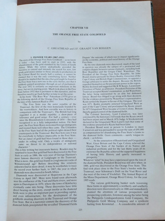 VII. THE ORANGE FREE STATE (WELKOM) GOLDFIELD (by C. GREATHEAD and J. F. GRAADT VAN ROGGEN) - (with sections: Pioneer Years (1867-1932); The New Era (1932-1939); The War Years (1939-1945); Post-War Developments; Recent Years: Current Developments: Future Prospects; Development of Geological Understanding in the Welkom Goldfield; A Review of Operations at Western Holdings: 1947-1981; Potted Histories - Other Mines);