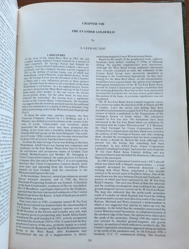VIII. THE EVANDER GOLDFIELD (by A. LEEB-DU TOIT) - (with sections: Discovery; The Early Days; Gold Production; Generalised Stratigraphy; Structural Geology; Looking Ahead).