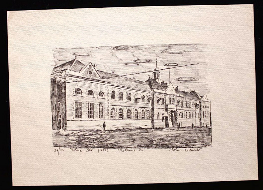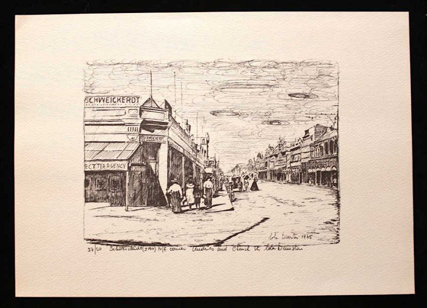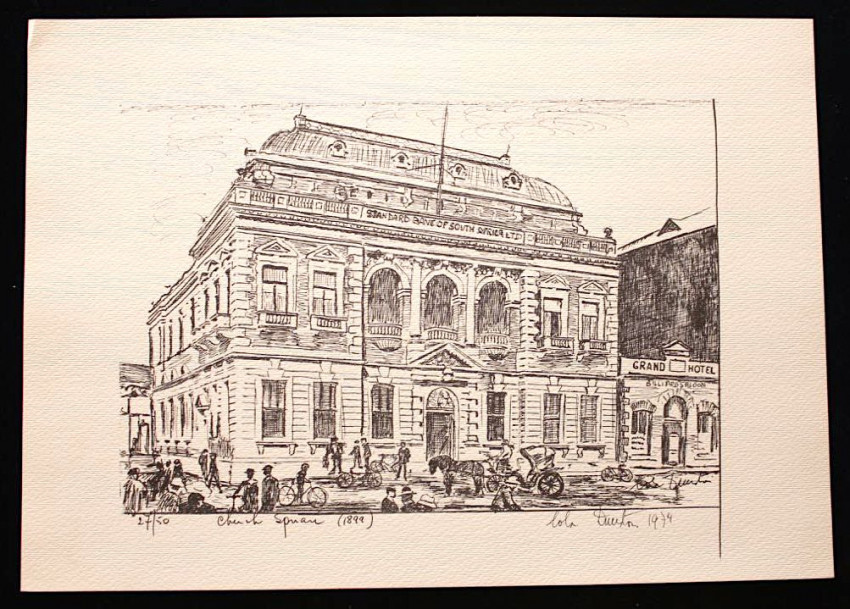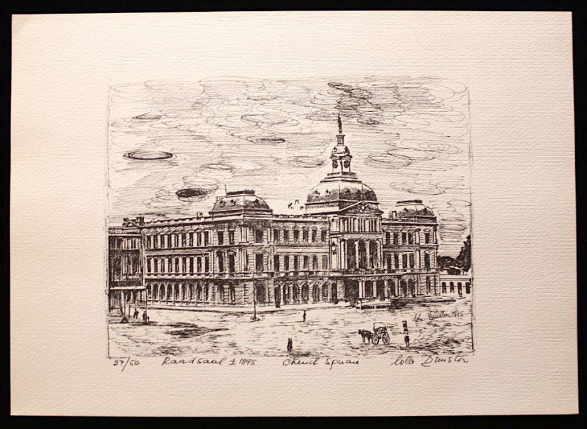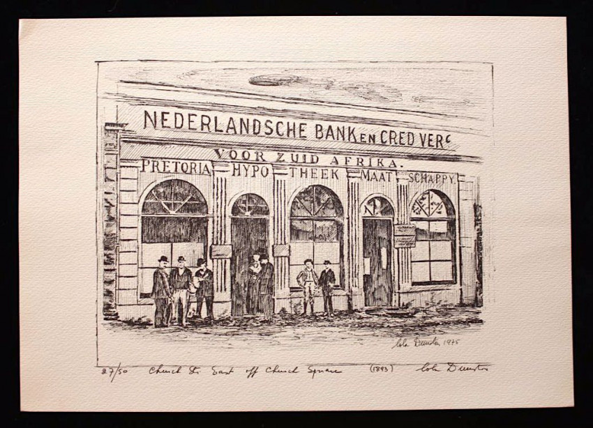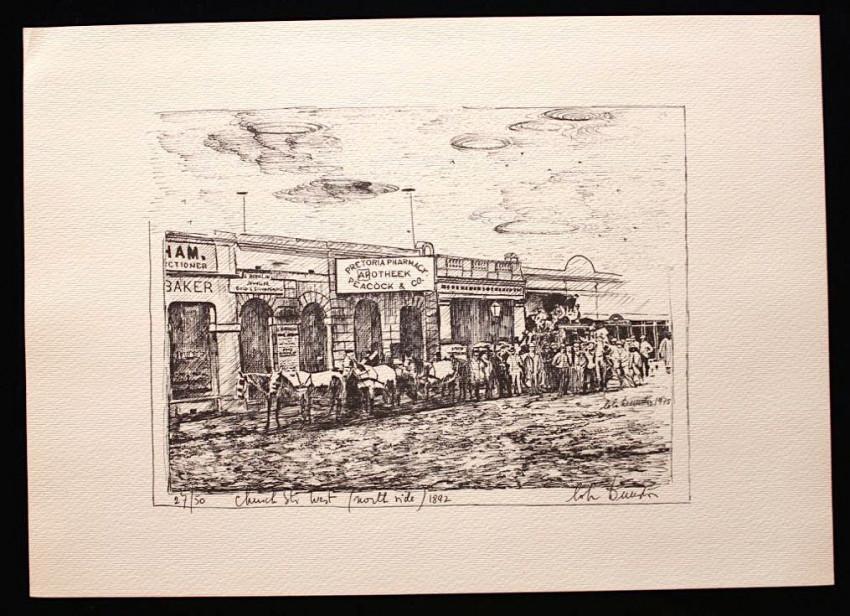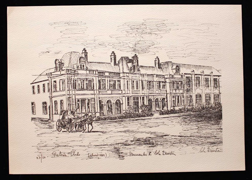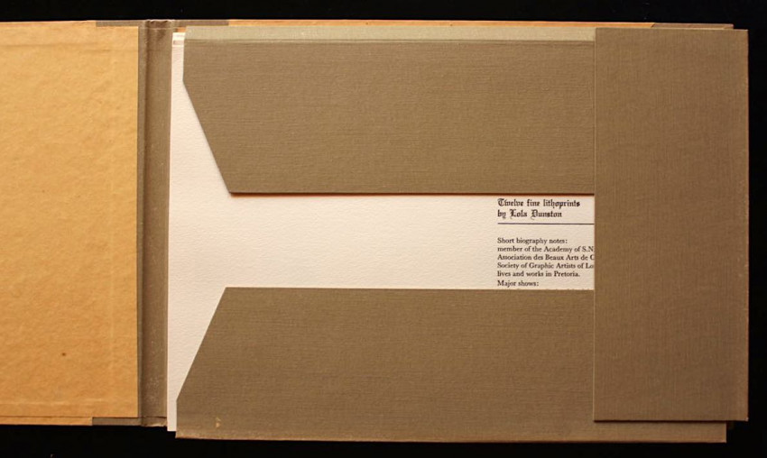A complete set of twelve fine lithoprints of Pretoria in the early days by Lola Dunston. Housed in the original half cloth portfolio with thick paper covered boards and embossed titles in blue ink on front panel.